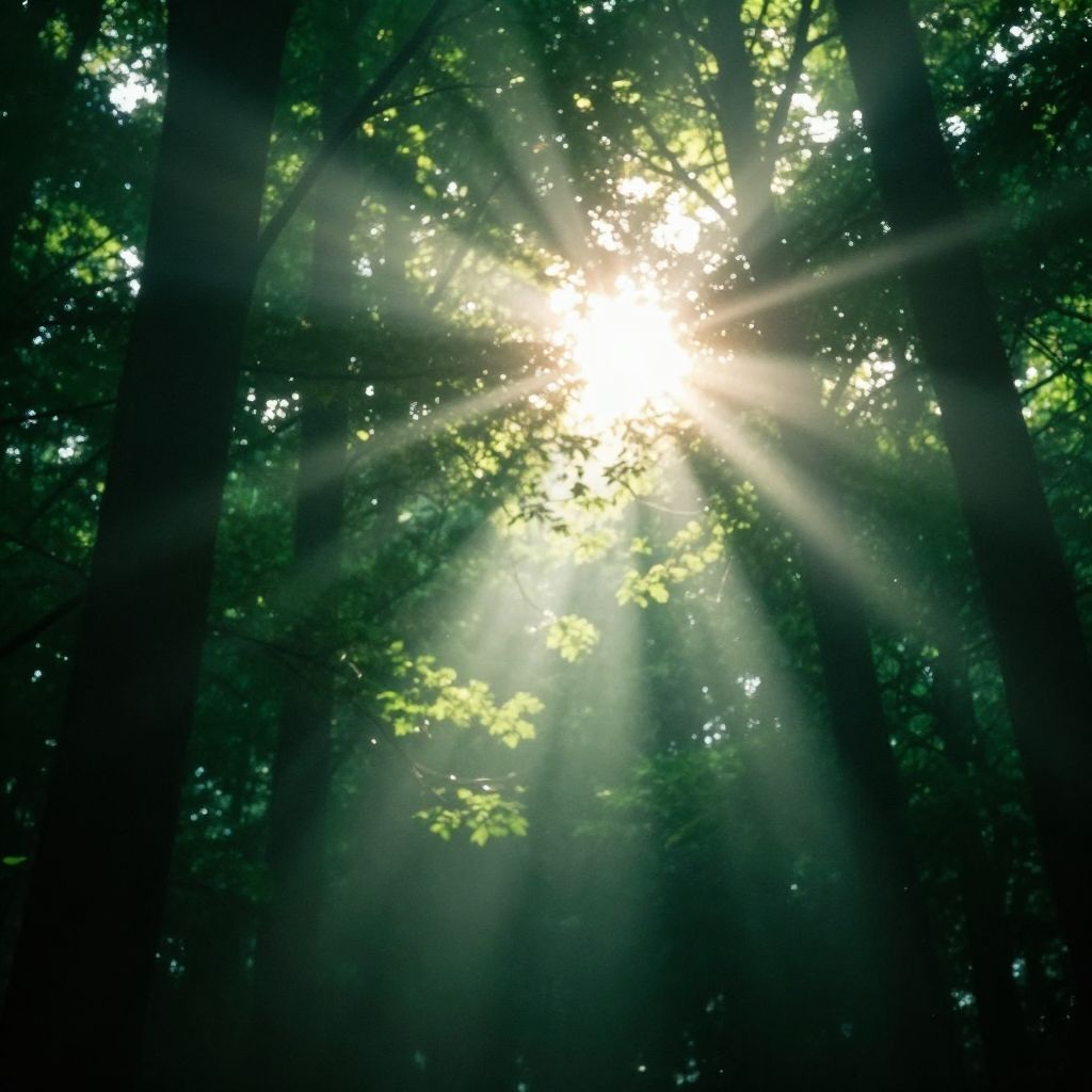 Photograph of sunlight streaming through dense, green foliage in a forest. Bright rays of light fan out from the center, illuminating small, scattered leaves and creating a radiant, ethereal glow. The background is dark, with deep green and black hues, emphasizing the contrast between the bright sun and the shadowy forest. Light beams create a sense of depth and texture, highlighting the leaves' delicate shapes and the forest's rich, verdant atmosphere. The image captures the serene, magical quality of sunlight filtering through trees.