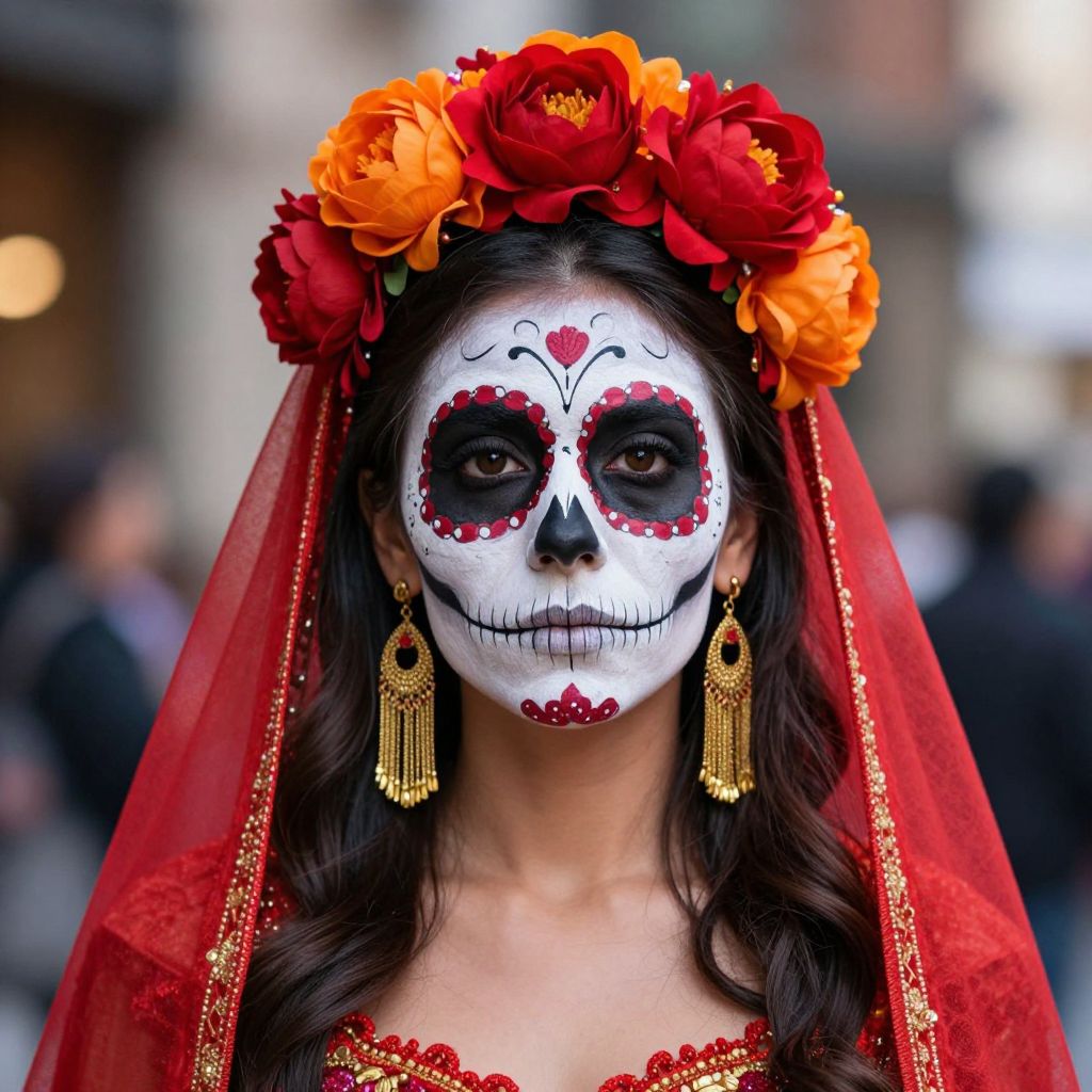 Woman wearing intricate sugar skull makeup, adorned with vibrant red and orange floral crown, long red veil, and gold tassel earrings, embodying the spirit of Dia de los Muertos or Carnival.
