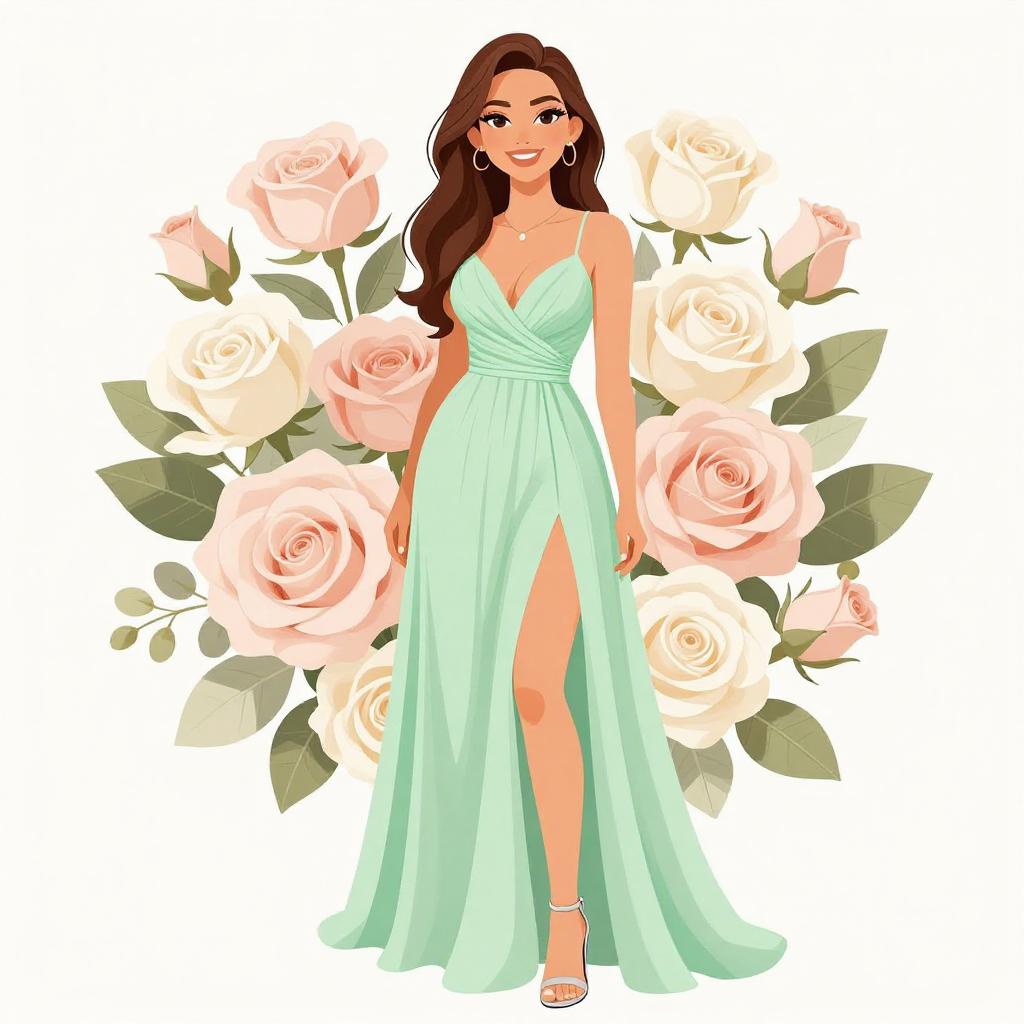 Woman with pretty face and pretty hair. smiling Woman, contemporary romantic, sleeveless chiffon dress in mint green, deep v-neckline, empire waist, high-low hemline with a thigh-high slit, strappy high-heel sandals, metallic clutch, dangling chandelier earrings, floral backdrop with roses and neutral tones. --sref 1467