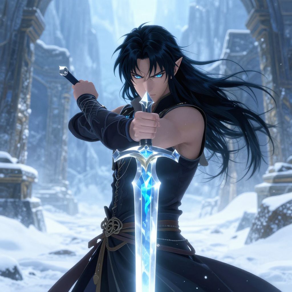 Anime elf man with dark flowing hair and piercing blue eyes, wielding a shimmering crystal sword, standing in a mystical snowy mountain pass surrounded by ancient ruins, dramatic lighting emphasizing his serene but powerful presence