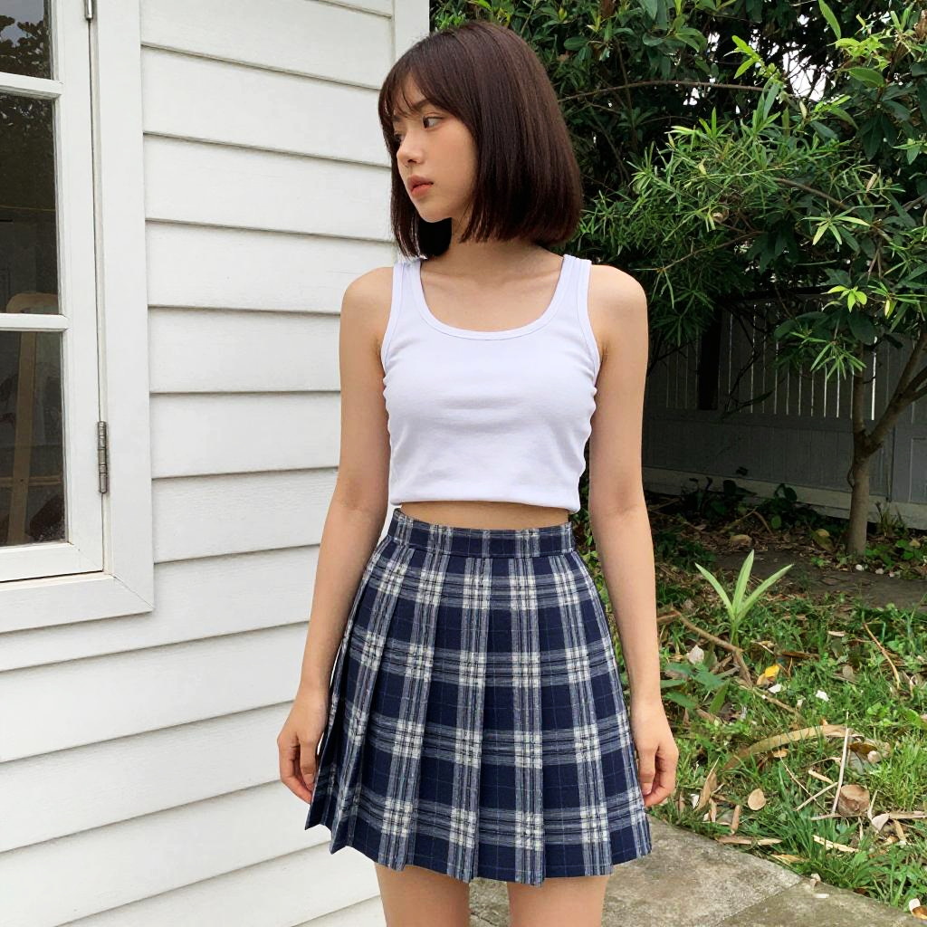 A young woman with a bob haircut stands outdoors near a house with white siding, wearing a white cropped tank top and a navy blue plaid pleated skirt. The photo captures a casual and fresh summer vibe in natural lighting with greenery in the background.