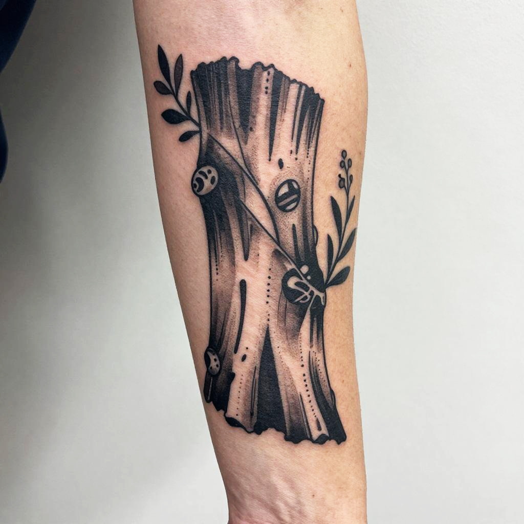 Black ink tattoo on arm: detailed, textured tree stump with a rope and small flowers, shaded for depth, minimalist style.