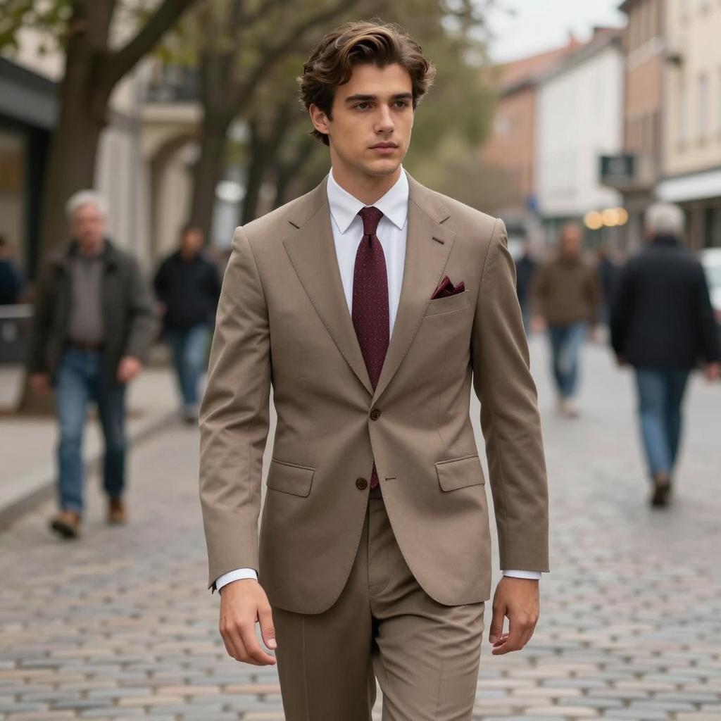 Wedding crashers costume, photorealistic, young man, standing in a crowded city street, wearing a tan suit with a red tie and pocket square, light blue shirt, short blonde hair, slightly smiling, blurred background, people in formal attire, daytime, cobblestone street, red awnings, summer outfit, formal event, handsome, confident, well-groomed, realistic lighting, casual pose