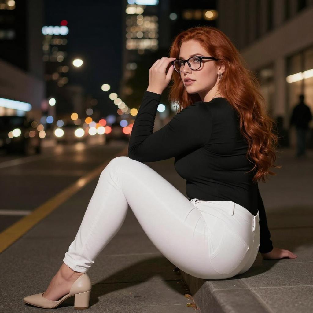 Photograph of a curvy woman with long red hair, wearing a black long-sleeve top and white tight pants, sitting on a city sidewalk at night. She looks over her shoulder, touching her glasses with her right hand. The background features brightly lit skyscrapers and blurred city lights. She wears beige shoes.