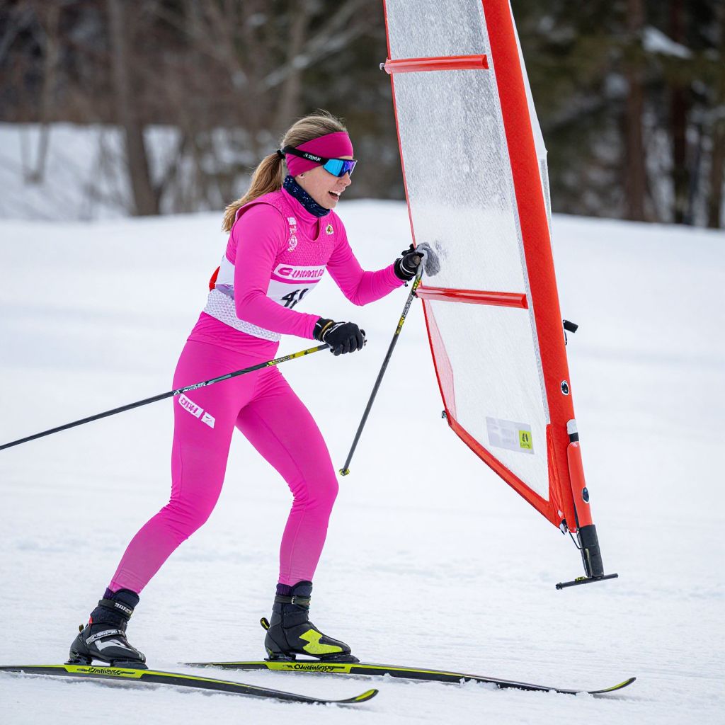 Photograph of a female cross-country skier in a bright pink outfit with matching headband and ski goggles. She is skiing on a snowy landscape with a red and white flagpole to her right. She holds ski poles in both hands and wears black gloves and yellow ski boots. Her blonde hair is tied back, and she has a white bib with numbers on her chest. The background shows a blurred, snowy forest. The image has a high contrast and vivid color palette.