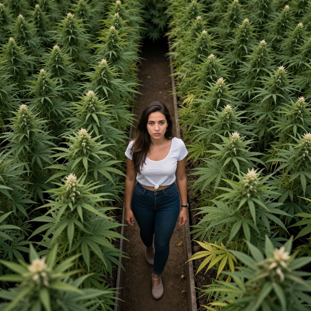 Photograph of a young woman with long dark hair, wearing a white tied-up blouse and dark blue jeans, walking down a narrow path between rows of tall, green cannabis plants with white buds. She has a focused expression and is looking directly at the camera. The path is dark and narrow, contrasting with the dense, lush greenery on either side. She wears light pink shoes and a black wristwatch. The image is taken from an overhead perspective, highlighting the symmetrical rows of cannabis plants. The background is filled with the dense green foliage, creating a natural, botanical setting.
