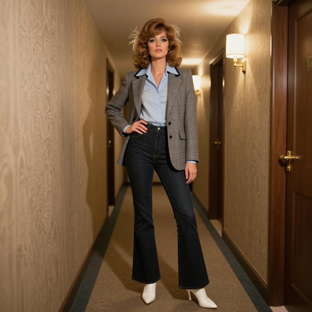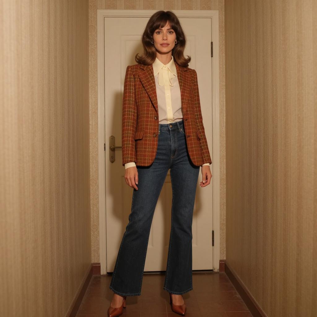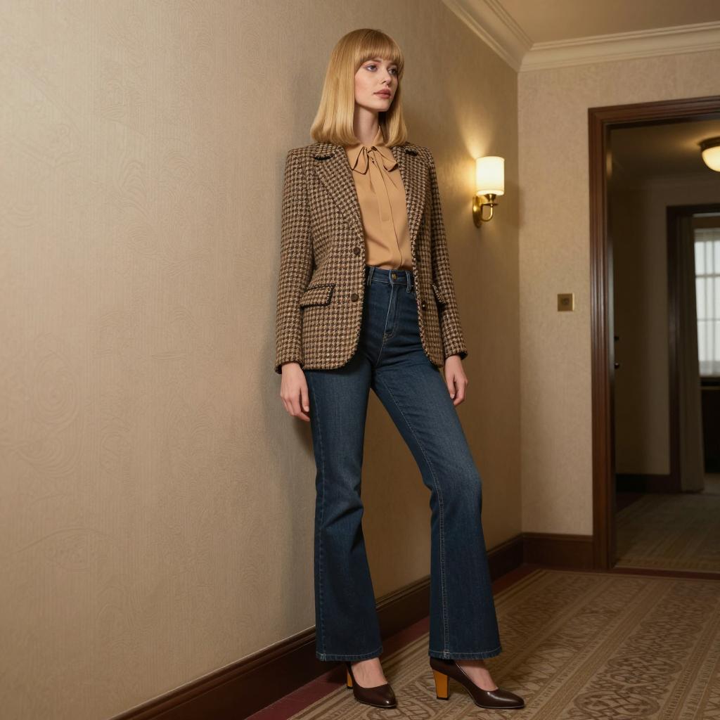 1970s fashion outfits, woman wearing tailored plaid blazer over collared blouse with high-waisted dark denim flared jeans and heeled shoes in grey check blazer with pale blue blouse and black flares on blonde woman with straight layered hair and side part posed in narrow hallway with patterned wallpaper and door behind her under soft bounced flash with minimal shadows, vintage 70s working woman style, mid-length fashion shot