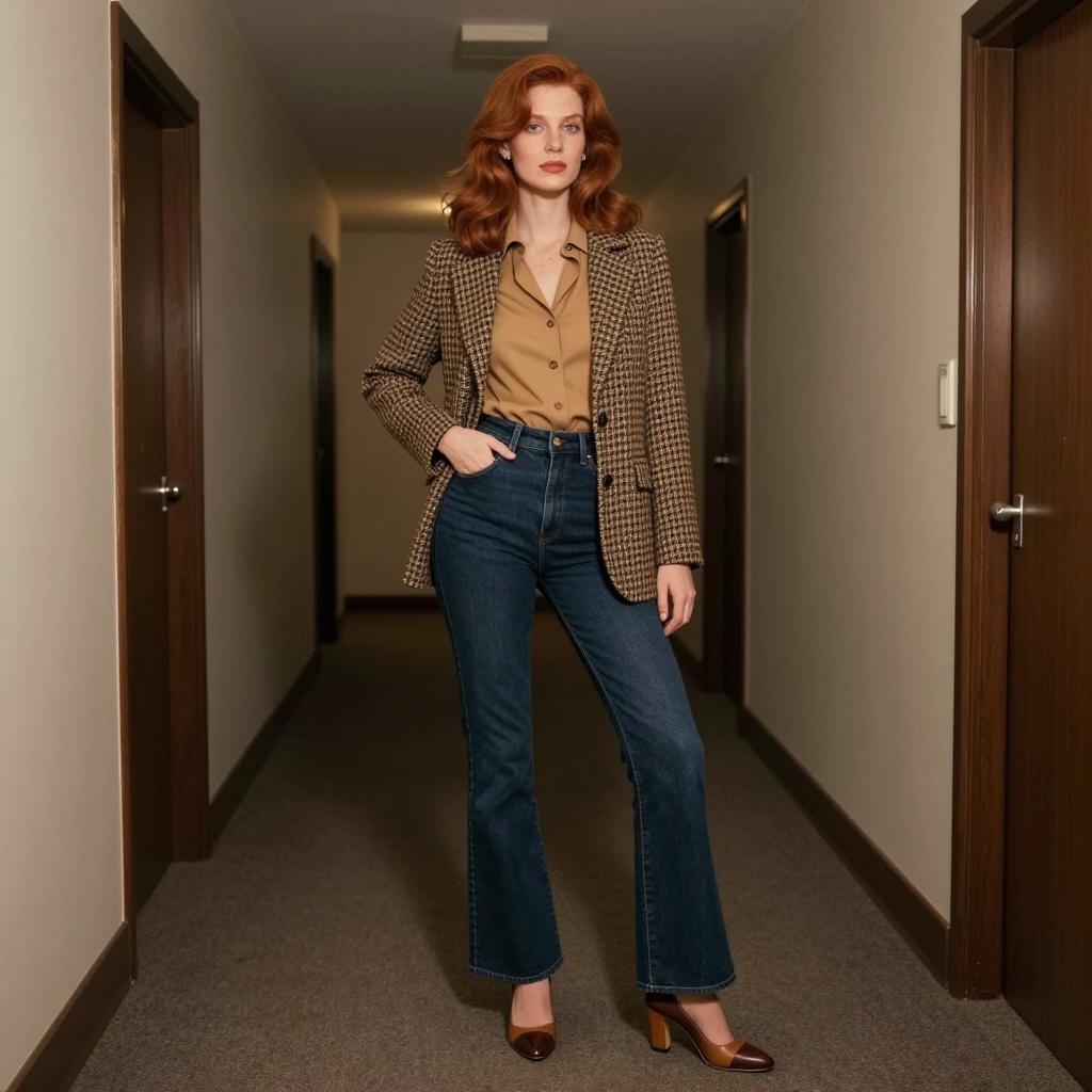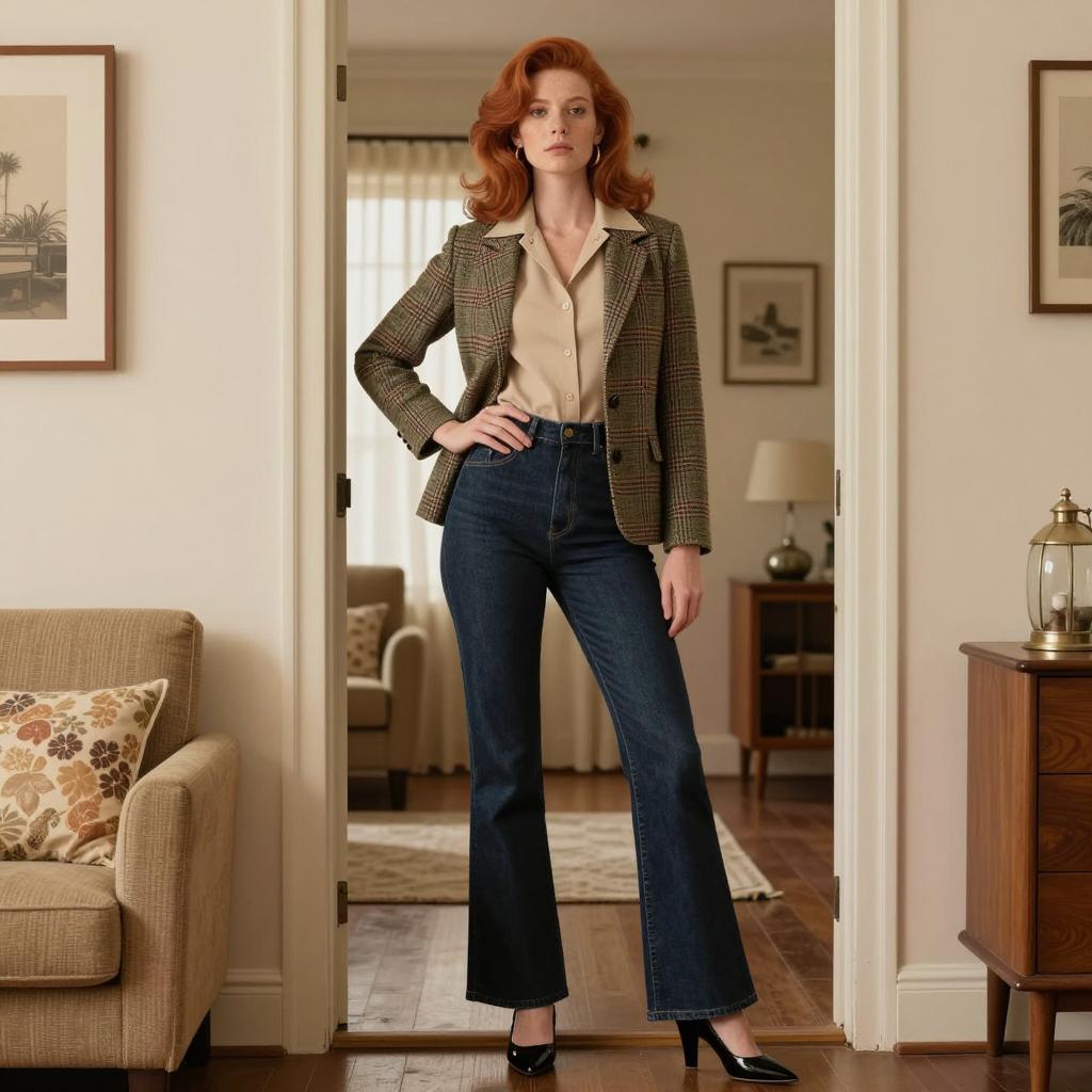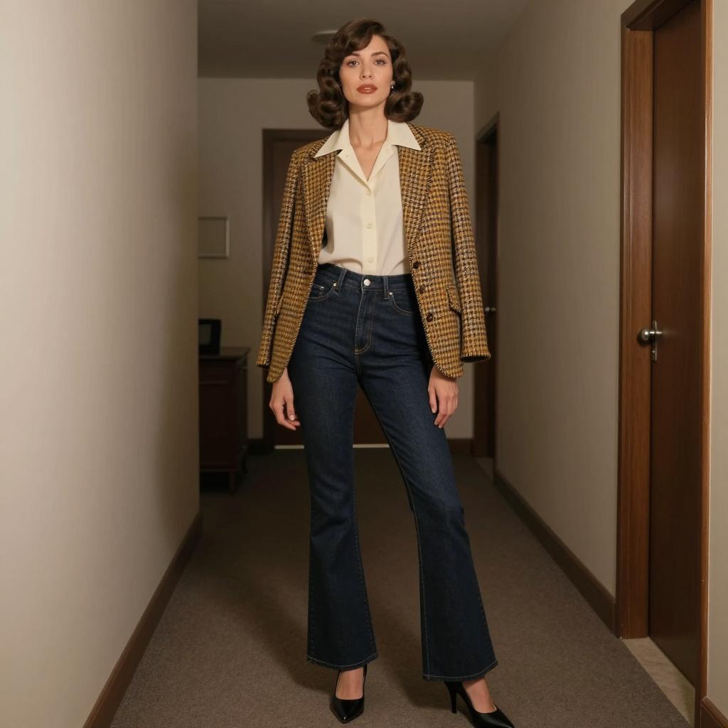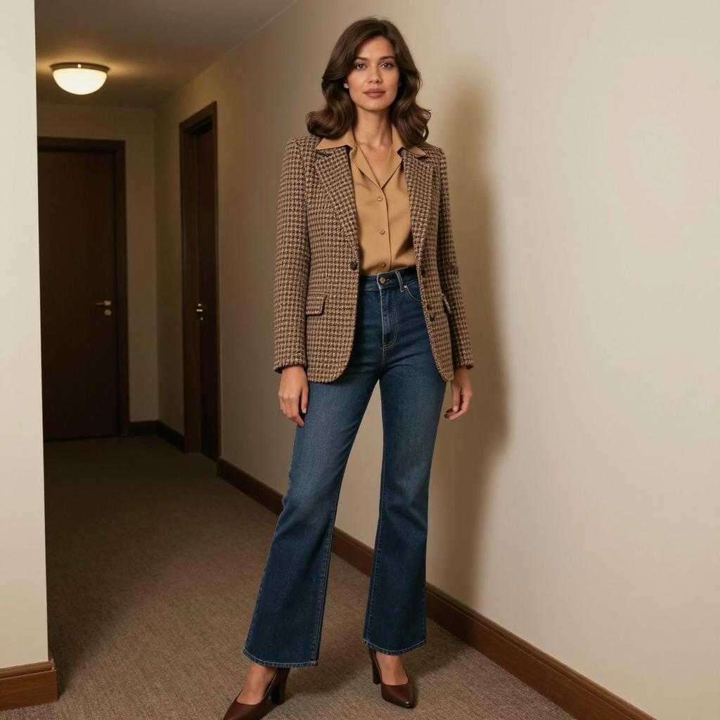 1970s fashion outfits, woman wearing tailored plaid blazer over collared blouse with high-waisted dark denim flared jeans and heeled shoes in grey check blazer with pale blue blouse and black flares on blonde woman with straight layered hair and side part posed in narrow hallway with patterned wallpaper and door behind her under soft bounced flash with minimal shadows, vintage 70s working woman style, mid-length fashion shot