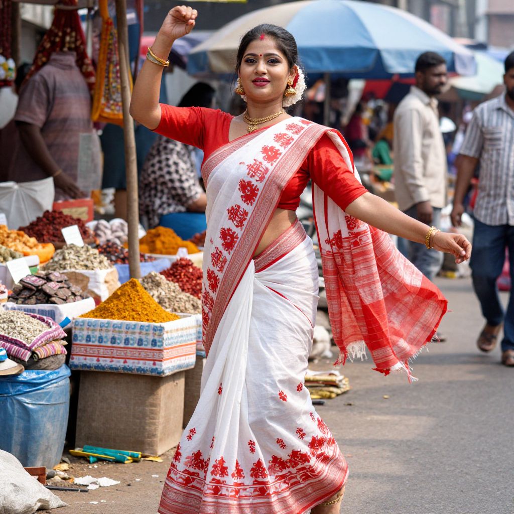 A vibrant snapshot of a Bangladeshi saree woman in a red and white classic saree dancing lightly in a bustling weekly market in Chittagong, her face adorned with a natural makeup, full lips, and a cheerful expression, the colorful surroundings of spices and fabrics reflecting off the sunlight, her saree flowing dynamically as she moves, traditional fabric patterns clearly visible. The woman has big tits and cute face