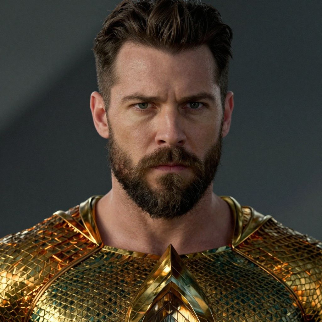 Photograph of a muscular, bearded white man with short dark brown hair and intense blue eyes. He is wearing a golden, scaled armor with intricate patterns and a prominent, pointed shoulder piece. The background is a solid dark gray, creating a stark contrast with the shiny gold armor. His expression is serious and focused, and the lighting highlights the texture of the armor and the contours of his face. The image has a high-contrast, dramatic style, emphasizing the warrior-like appearance.