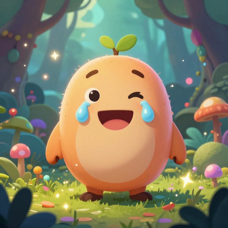 Lolsob inspired fantasy creature with exaggerated tear drops and a joyous grin, set in a magical forest with sparkling lights and whimsical flora, vivid colors and soft textures, imaginative and heartwarming scene