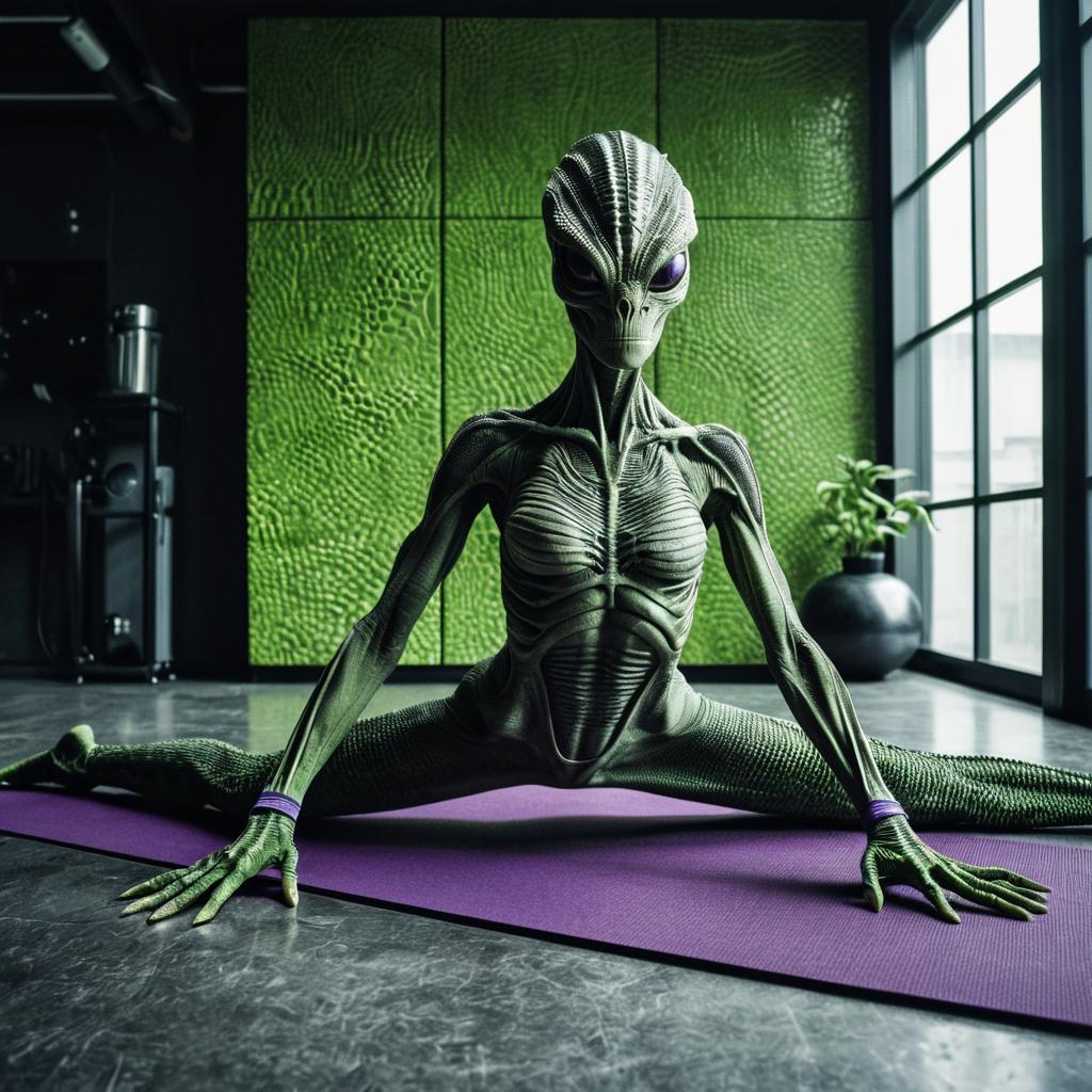 Green amorphous alien with exaggerated limbs and sinewy black textured bodysuit performing a seated yoga pose on a lime green mat in a modern, minimalist room with industrial design elements. The scene includes a red exercise ball, large windows, indoor plants, and sci-fi inspired artwork on the wall.