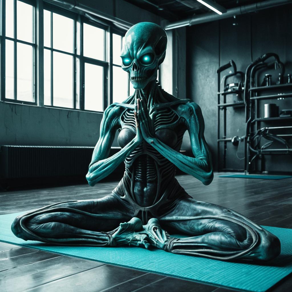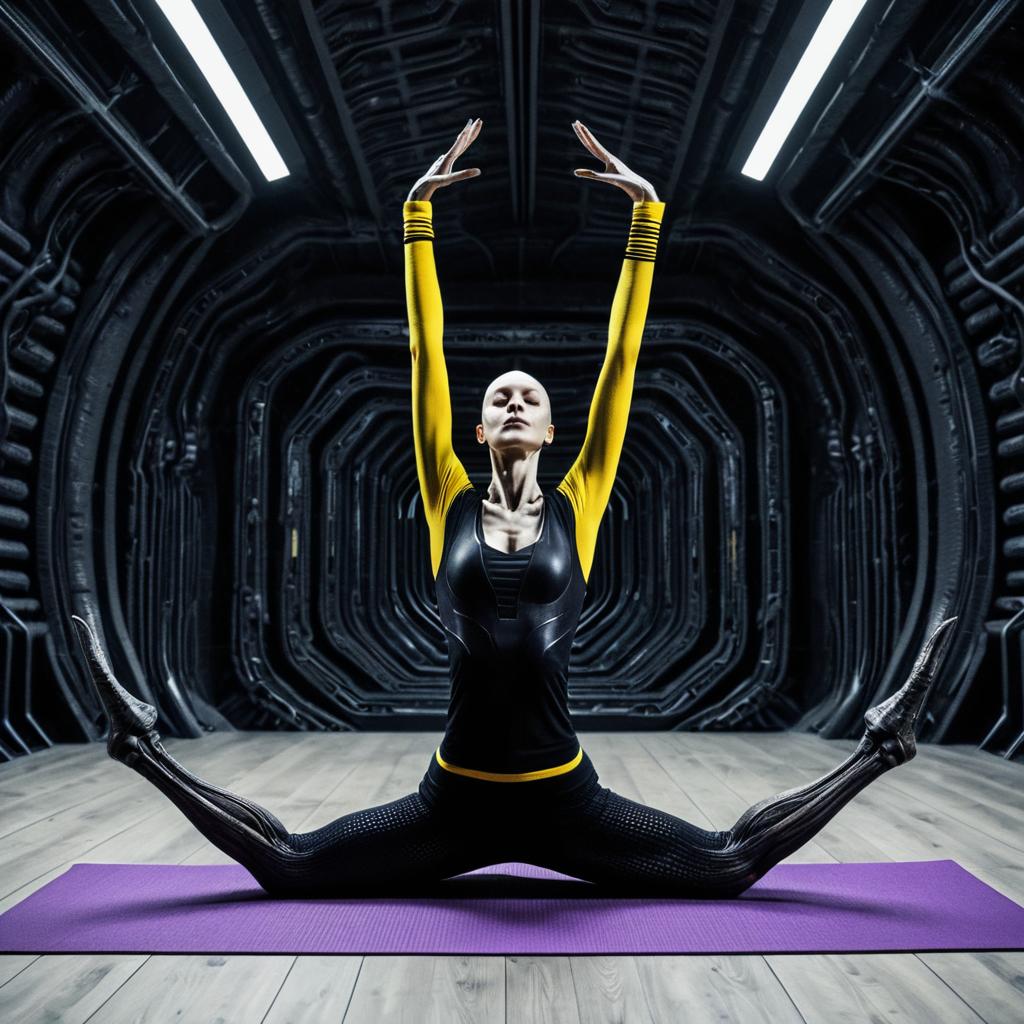 An amorphous alien performing a yoga pose in a modern, minimalist room, black sinewy texture, futuristic, exaggerated limbs, red sweatbands, lime green mat, contrast between organic and industrial, inspired by H.R. Giger