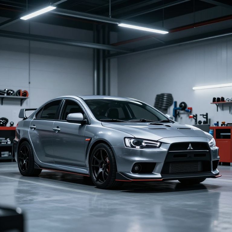Mitsubishi Lancer Evolution 11 parked in a modern industrial garage, illuminated by soft overhead lights, showcasing sharp angles and sleek design, with a background of tools and car parts, photorealistic style, high detail on wheels and headlights