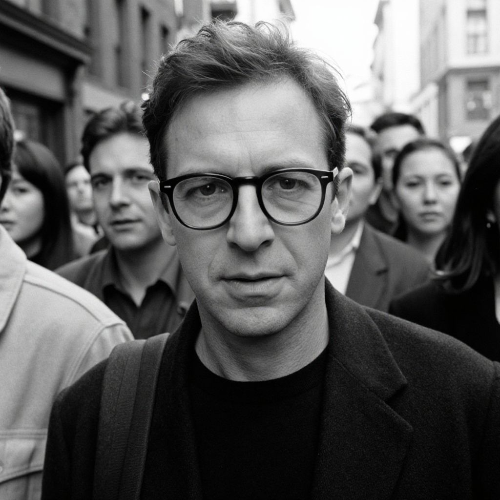 A black and white photo by Annie Leibovitz features a man wearing glasses with his face centered, surrounded by a crowd in a street scene, captured in 1998.