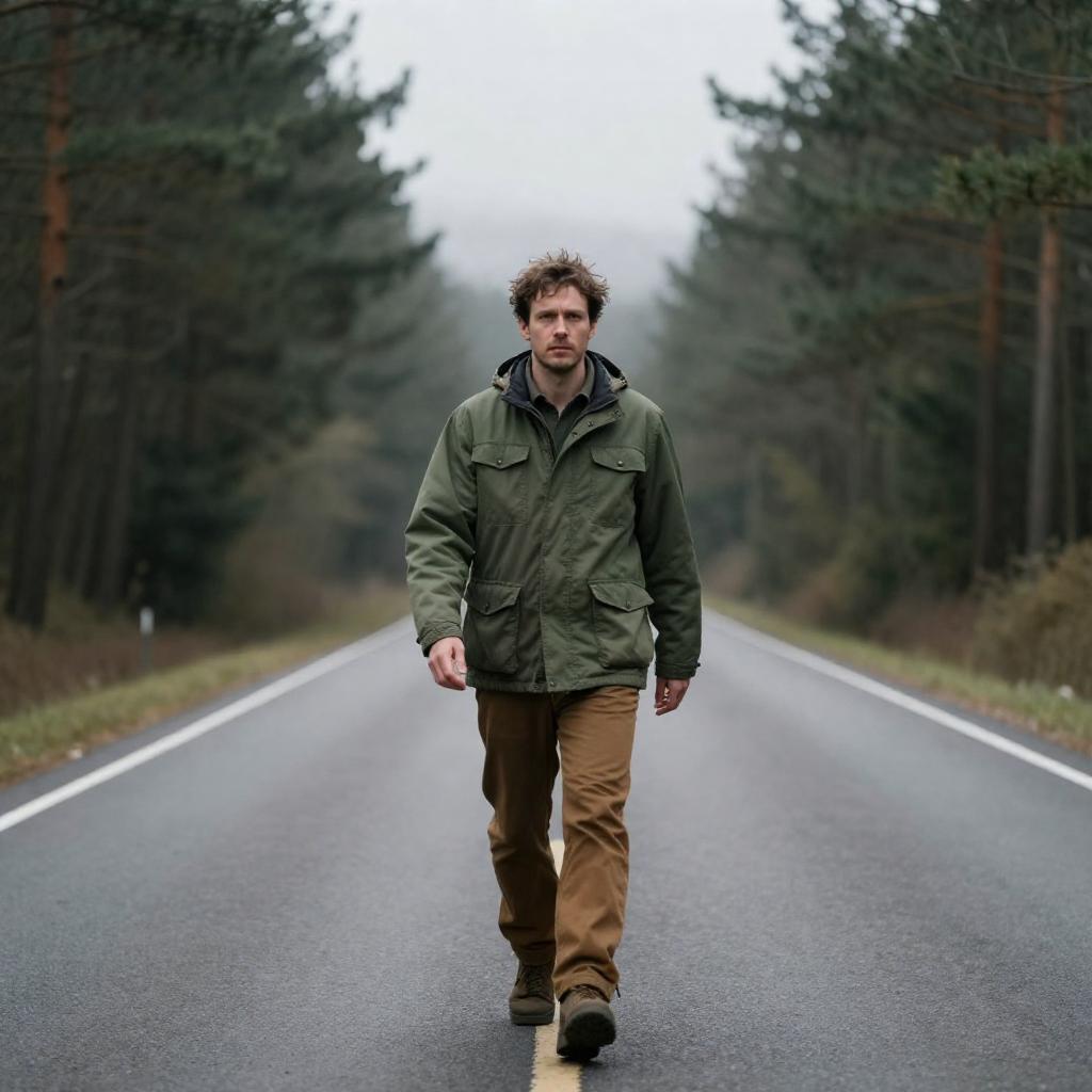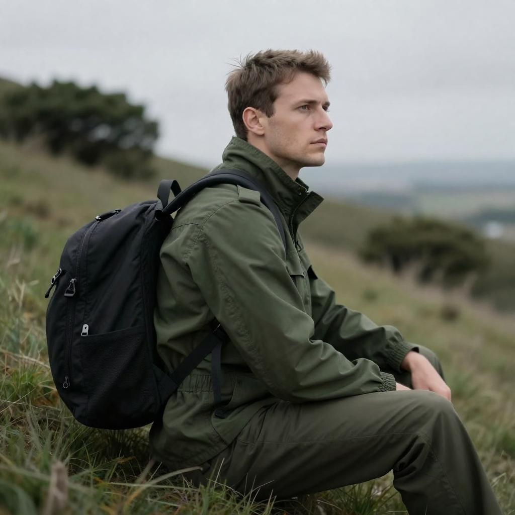 Man with short brown hair, serious expression, wearing red sweater and beige pants, stands on rocky terrain holding a backpack and shovel. Overcast sky, distant hills, and road in background. Wide open landscape, rugged terrain.