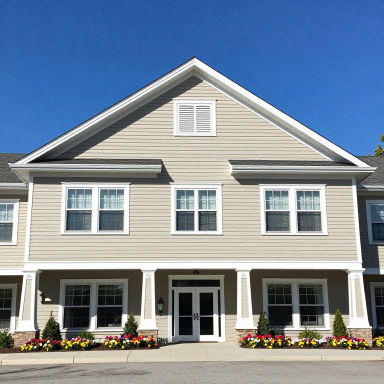 Photograph of a two-story beige house with white trim, large windows, a central door, and colorful flower beds under a bright blue sky.