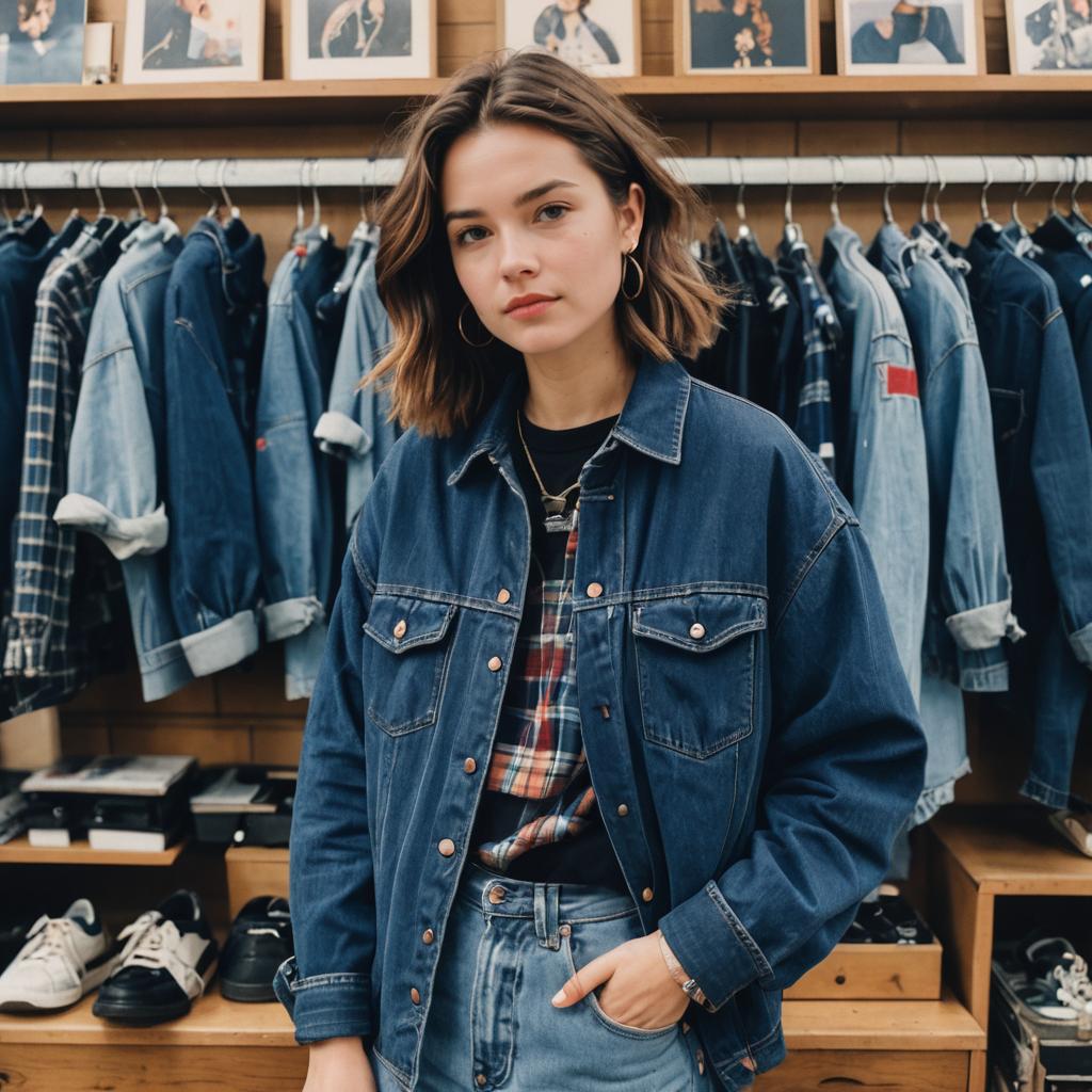 Young woman dressed in 1990s fashion, wearing a denim jacket, baggy boyfriend jeans, white t-shirt, and denim sneakers. She stands casually in a vintage-style hair salon with flannel shirts, jackets, and retro accessories displayed on wooden shelves and hangers behind her. The style includes muted colors, plaid patterns, and a grunge aesthetic.