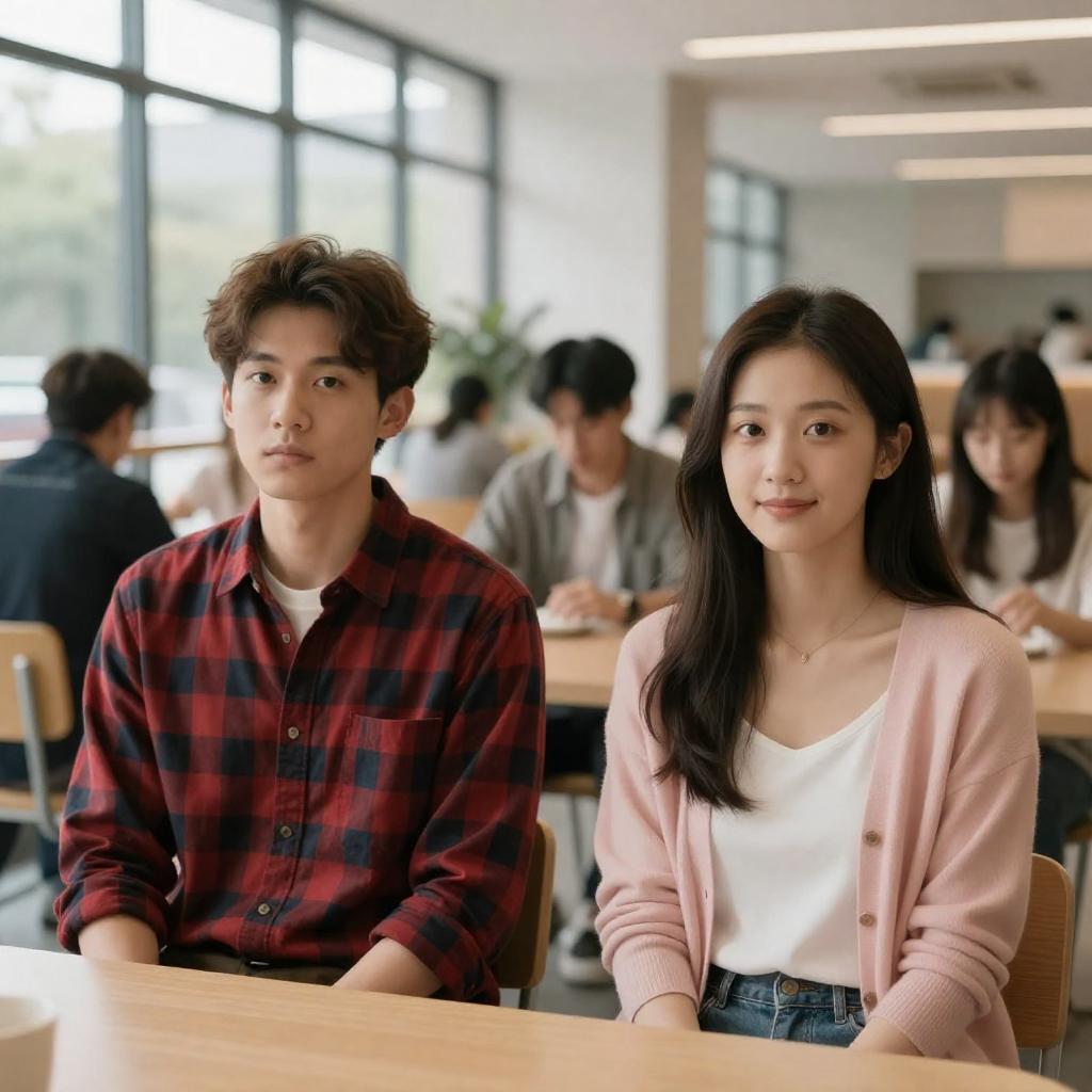 Photograph of a man and woman walking through a bustling, neon-lit city street at night. The man, with short dark hair, wears a beige double-breasted suit and black tie. The woman, with long brown hair and bangs, wears a black floral blouse and high-waisted blue jeans. Bright, colorful signs and people fill the background.