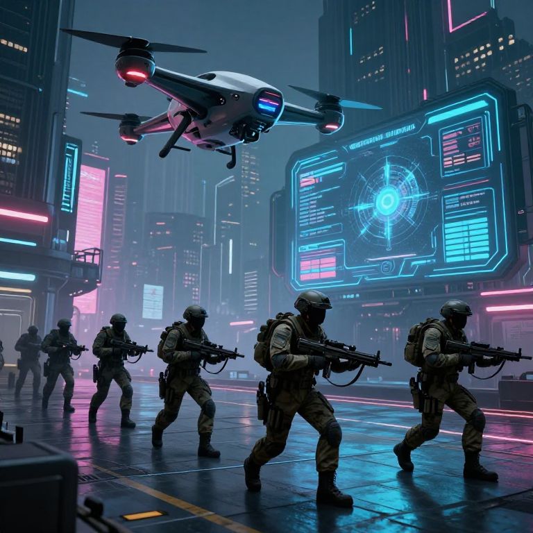 Army AI prompt: A cyberpunk military installation where AI troops execute precise maneuvers in a neon-lit cityscape, advanced drones flying overhead, and interface screens displaying real-time threat analysis and command protocols.