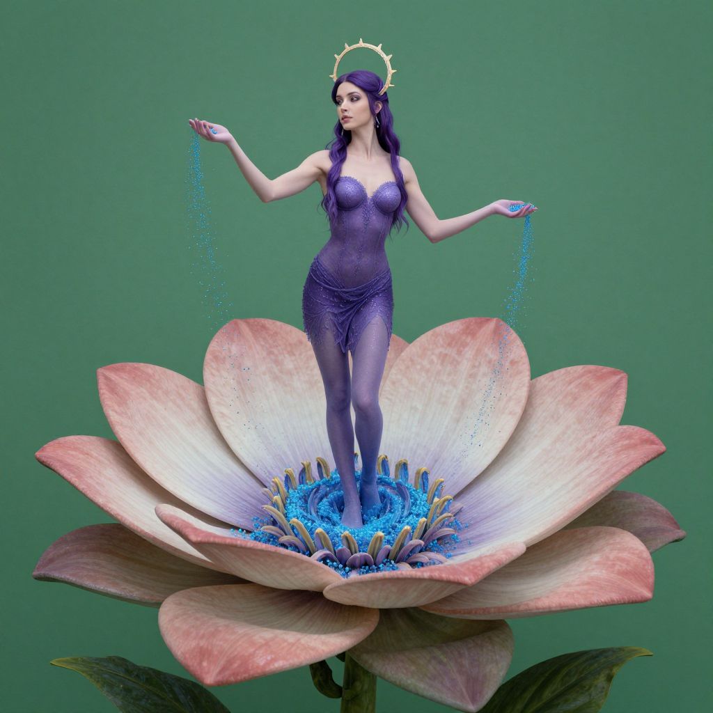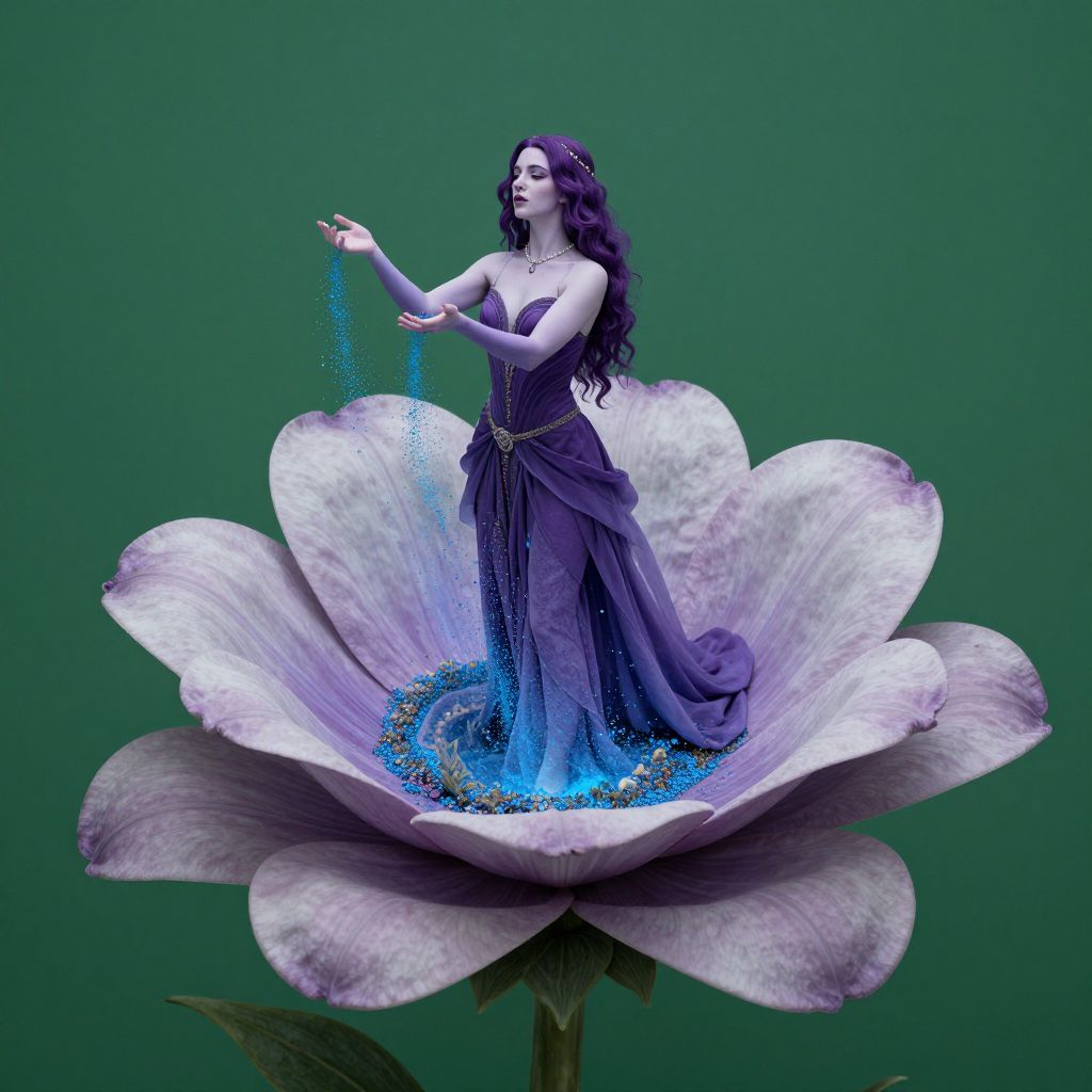Art for Oona, Queen of the Fae shows a purple woman emerging from a giant flower on a green background. Blue mana spills from her hands like pollen.