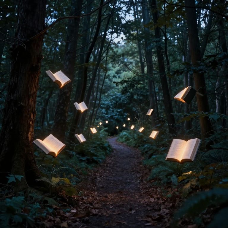 A mystical forest bathed in twilight is illuminated by levitating books whose glowing pages cast ethereal light, creating a surreal pathway through the trees.