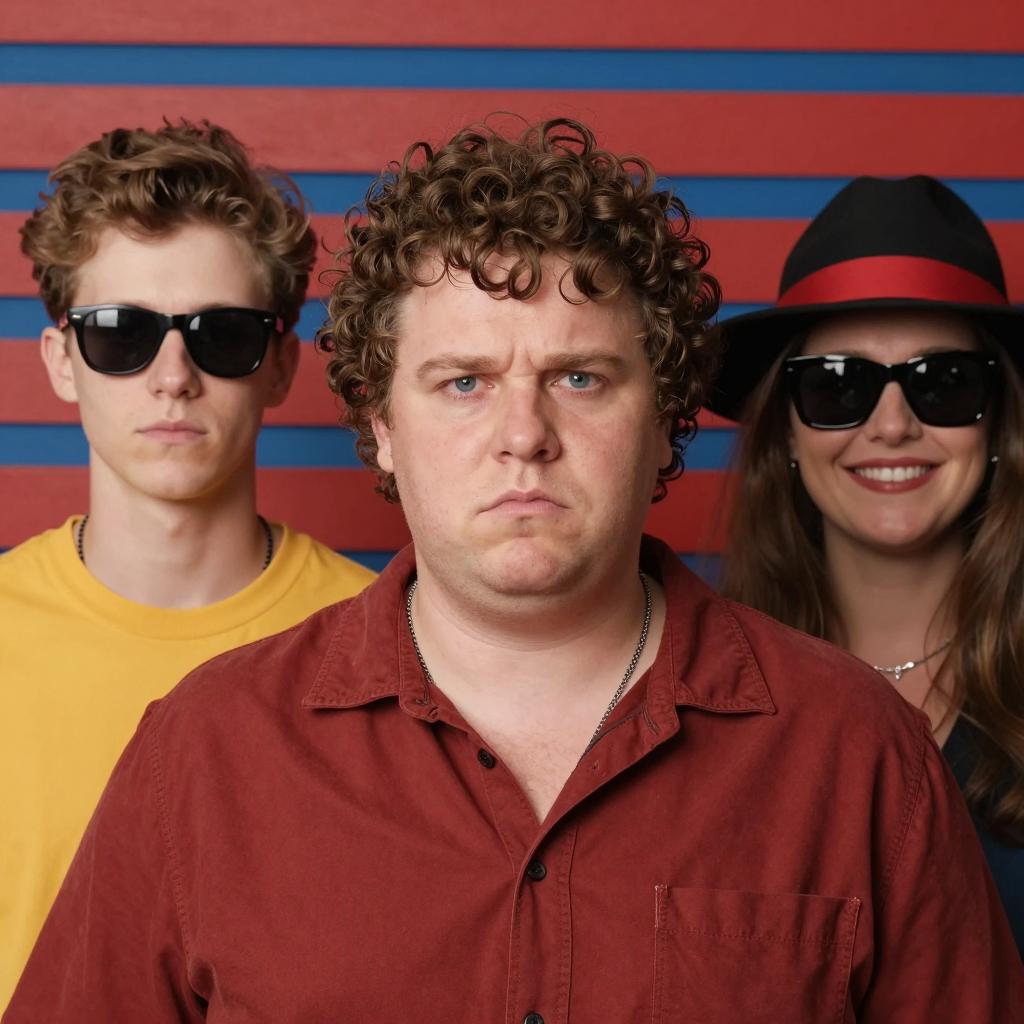 Portrait of three adults standing in front of a red and blue striped wall. In the center is a heavyset man with curly brown hair, wearing a red button-up shirt and a silver necklace, showing a serious expression. To the left is a young man with short brown hair, wearing black sunglasses and a yellow T-shirt, with a neutral expression. To the right is a woman wearing a black wide-brim hat with a red band, black sunglasses, long brown hair, smiling warmly. All three individuals have light skin tones.