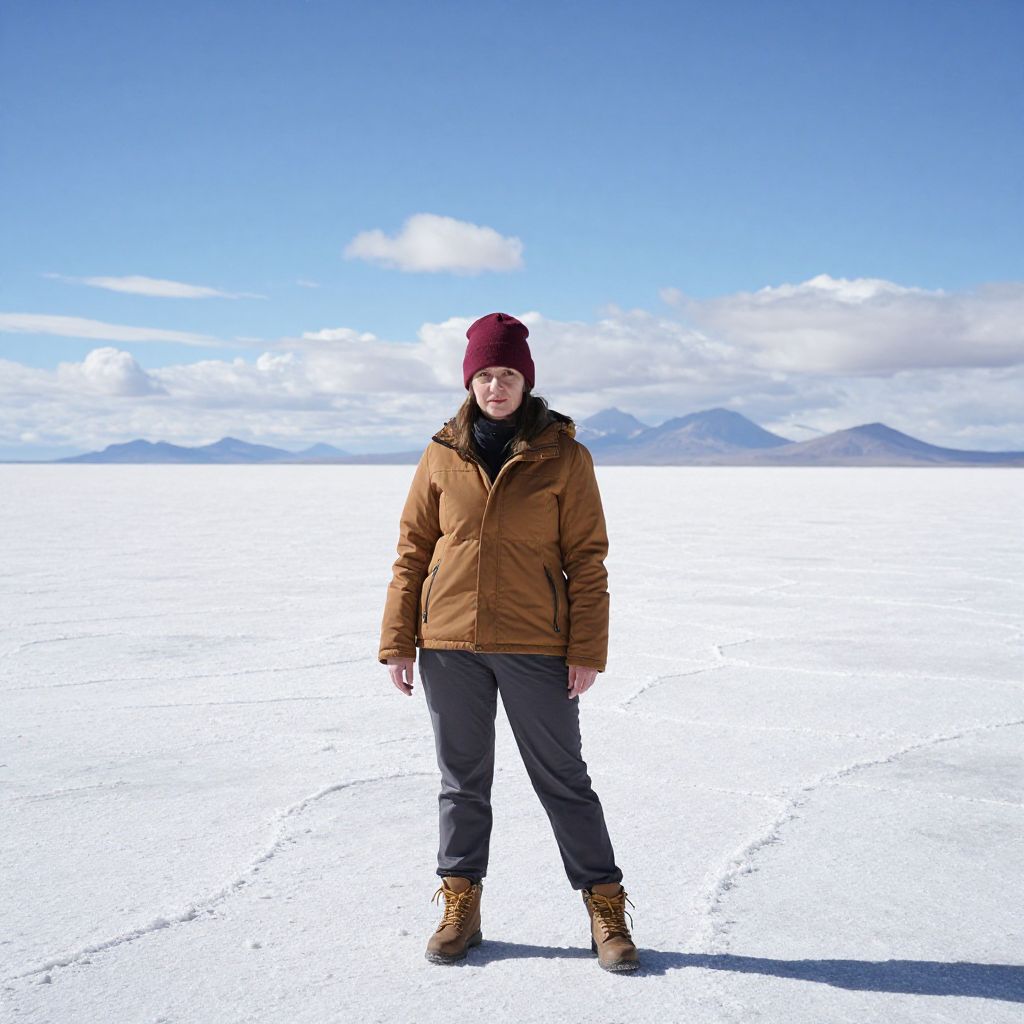 Woman stands confidently on the expansive Uyuni Salt Flats in Bolivia, dressed warmly in a brown jacket, red beanie, and gray pants, with distant mountains and scattered clouds framing the serene landscape behind her.