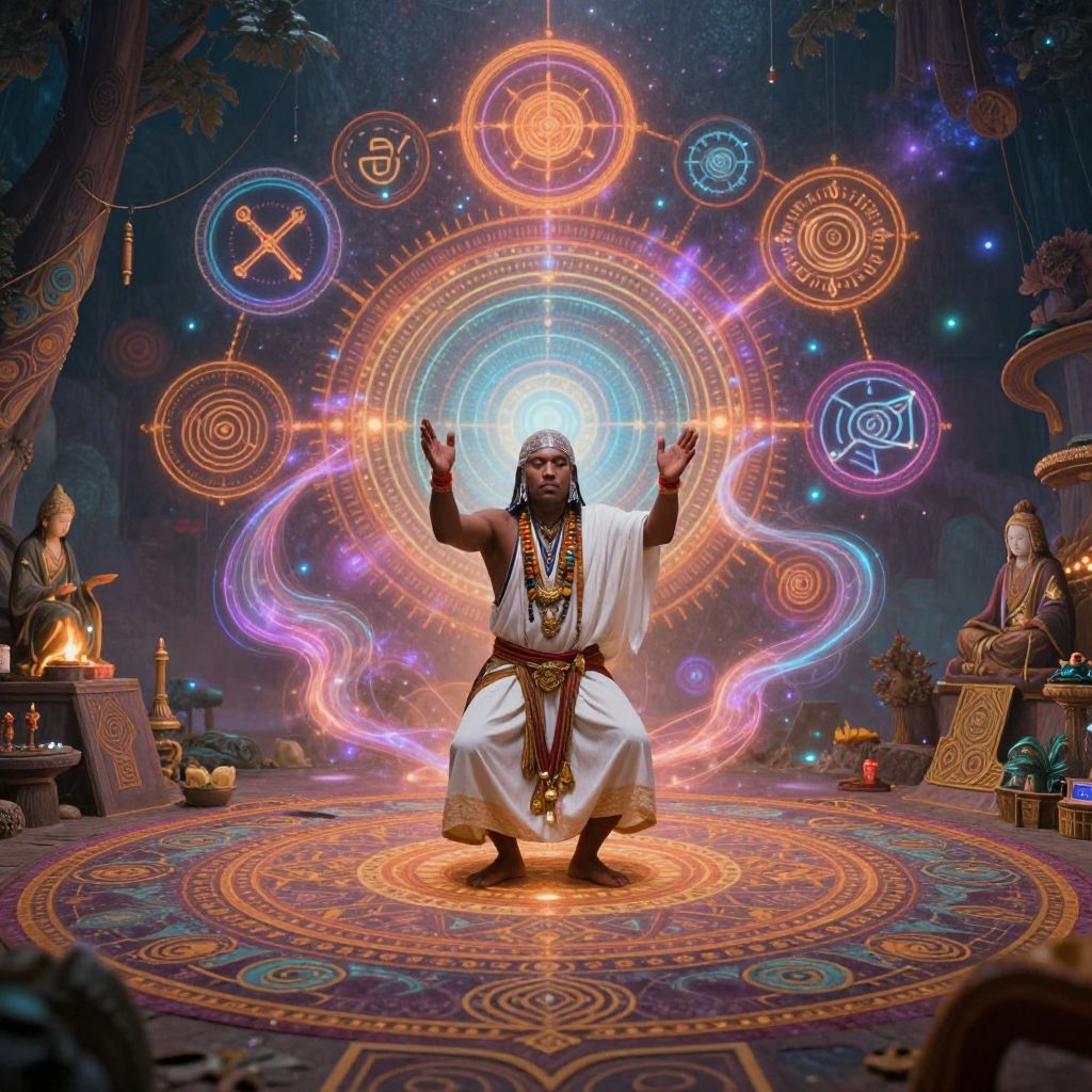Photograph of a dark-skinned, muscular man in white robe, hands raised, surrounded by glowing circular magical symbols, set in a mystical, colorful