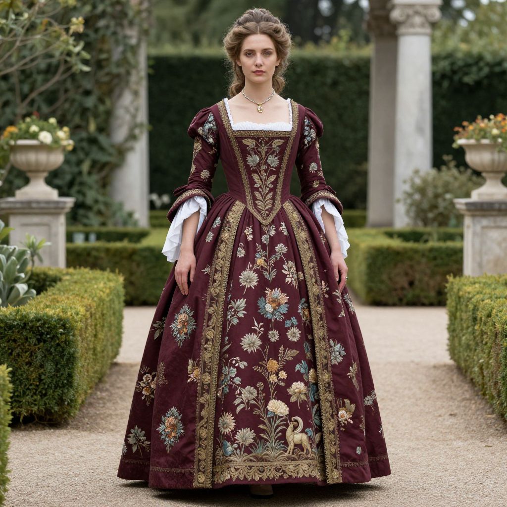 A woman in a regal, burgundy dress with intricate floral and animal patterns stands in a classical garden setting, evoking a Renaissance or classical regency style.