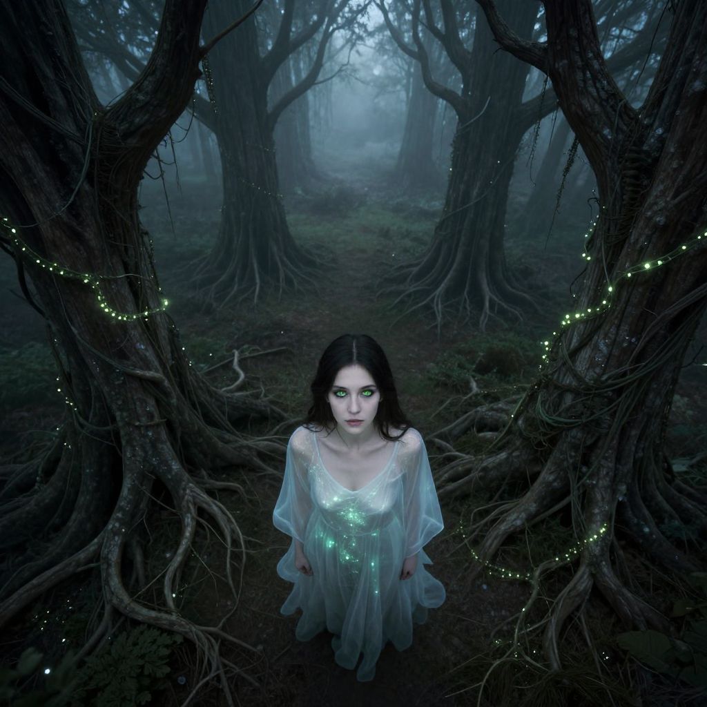 Imagine a panoramic digital artwork capturing the enigmatic beauty of a woman with mesmerizing emerald eyes set against the backdrop of a surreal, misty forest reminiscent of dystopian visions. From an aerial perspective, her silhouette is juxtaposed against ancient tree formations resembling gnarled giants, their roots and branches entwined with glowing bioluminescent vines. This haunting scene evokes mystery as the woman's translucent garments absorb ambient light, casting a spectral glow on her delicate features while emphasizing her solitude amidst the haunting beauty of this unknown realm.