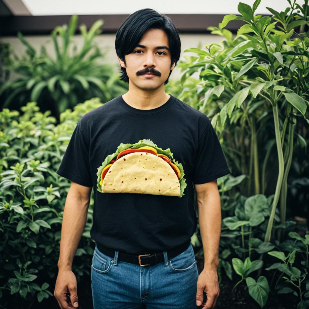 Adult realistic taco costume,1boy,male focus,solo,shirt,looking at viewer,t-shirt,pants,black hair,blurry,standing,black shirt,short hair,plant