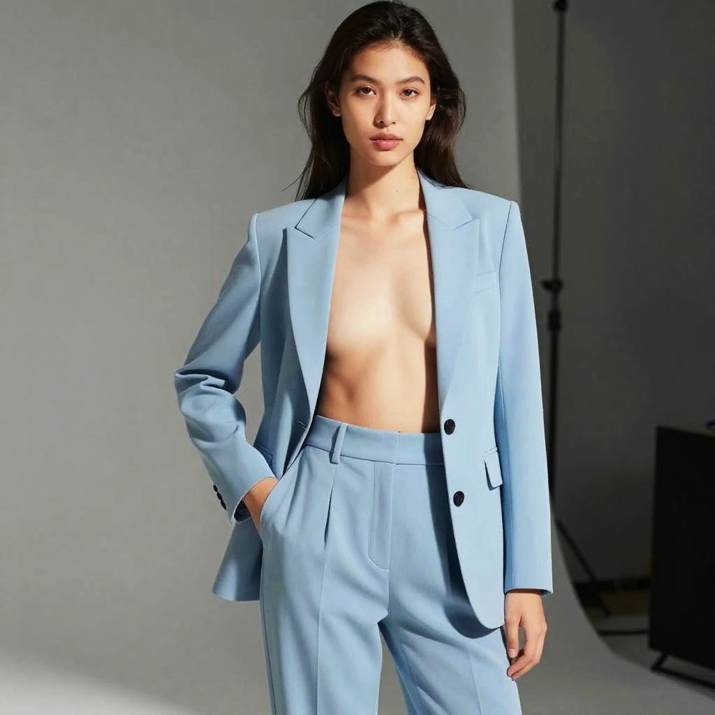 A stylish young woman poses confidently wearing a light blue tailored blazer and matching high-waisted pleated trousers, with no shirt underneath, highlighting a bold and modern fashion statement. The image features sharp, natural lighting that adds depth and contrast to the poised model against a simple background.