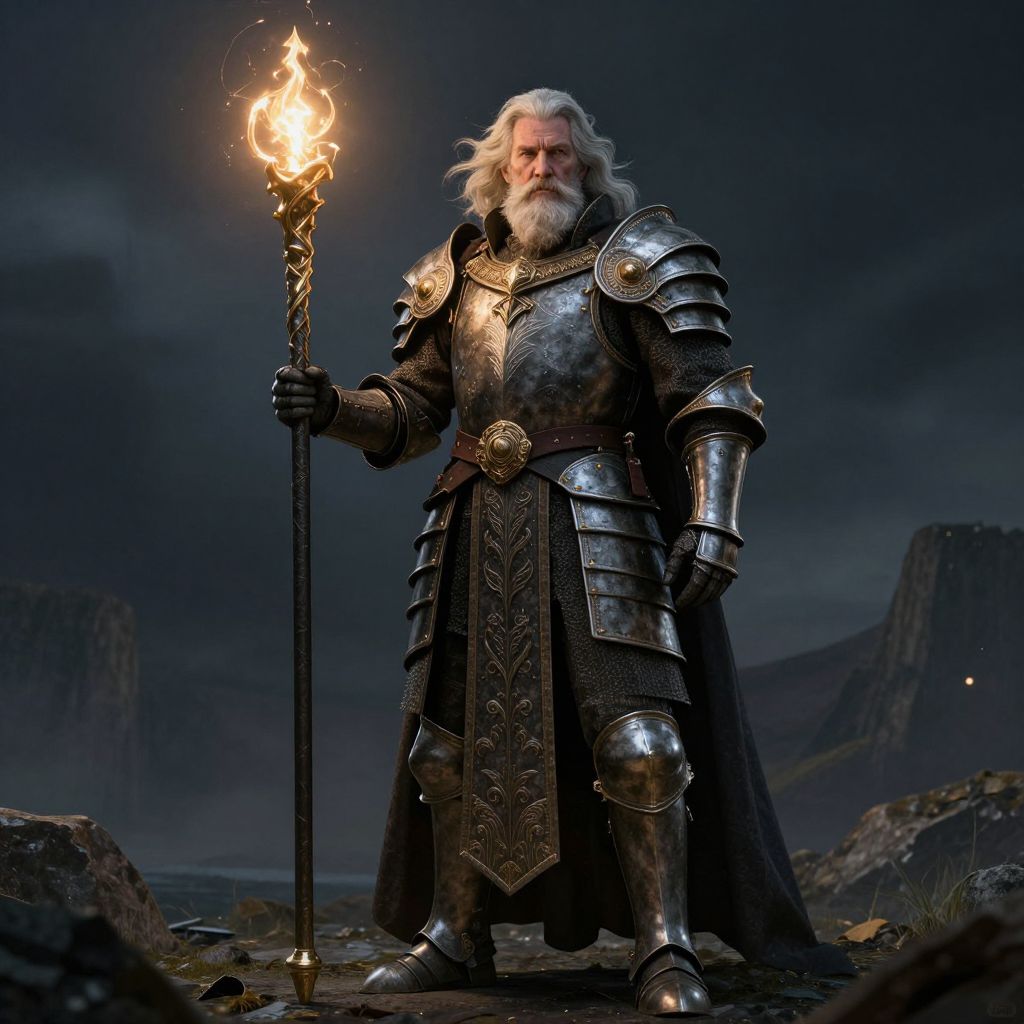 A majestic, old man in ornate armor holds a glowing staff, standing in a dramatic, dark landscape.