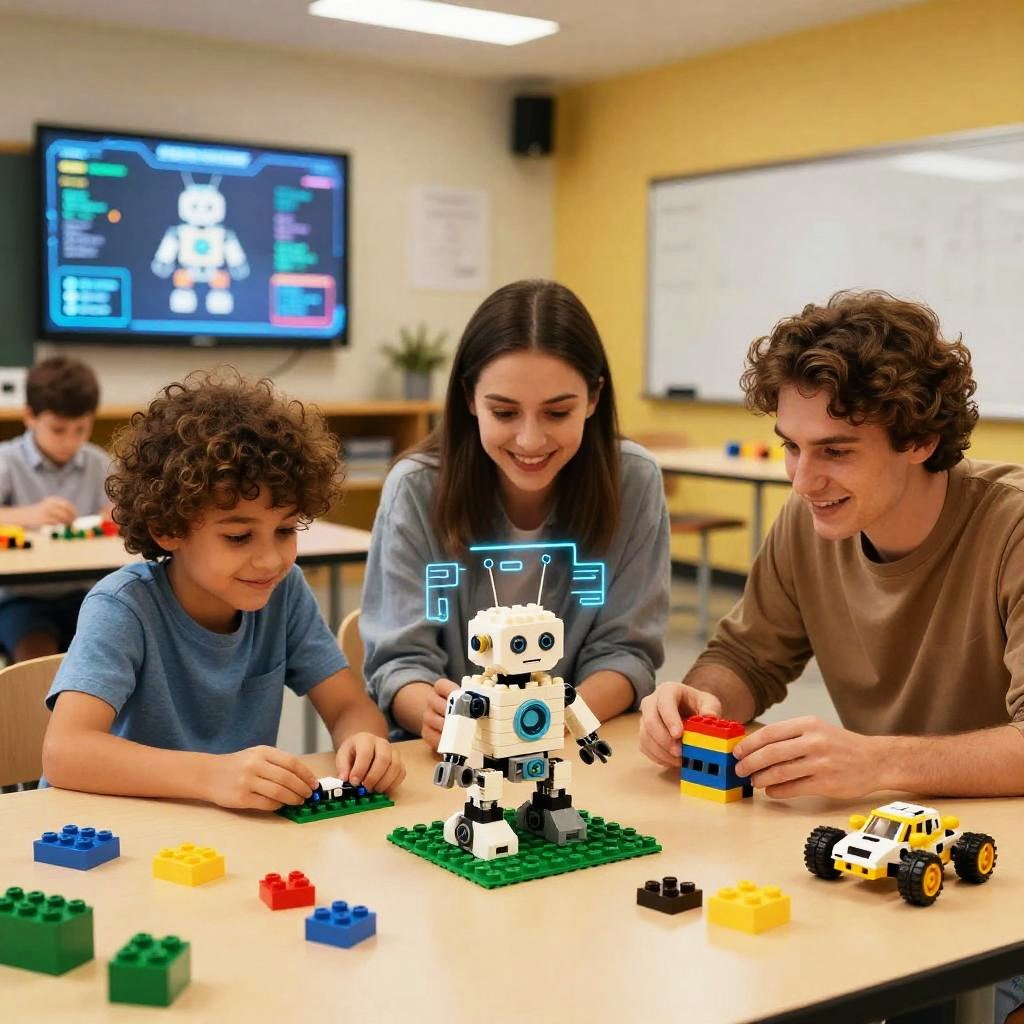 AI Lego sets in an educational setting, children and adults collaboratively building intelligent robots and AI gadgets from Lego bricks, futuristic classroom environment with digital displays and augmented reality elements, warm and inspiring mood