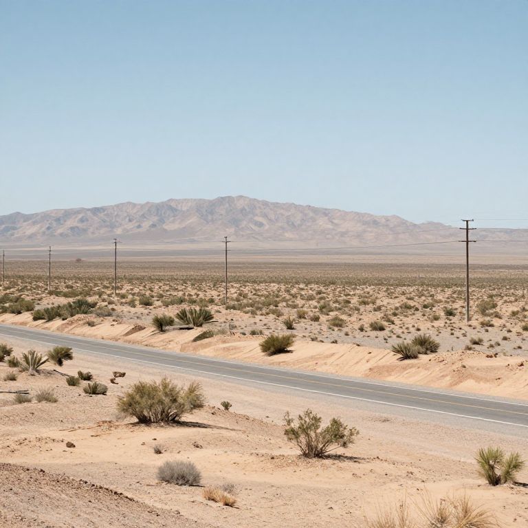 A detailed desert landscape with a vast open road running horizontally, surrounded by sparse vegetation and power lines, under a clear sky with distant mountains.