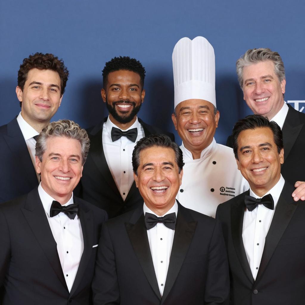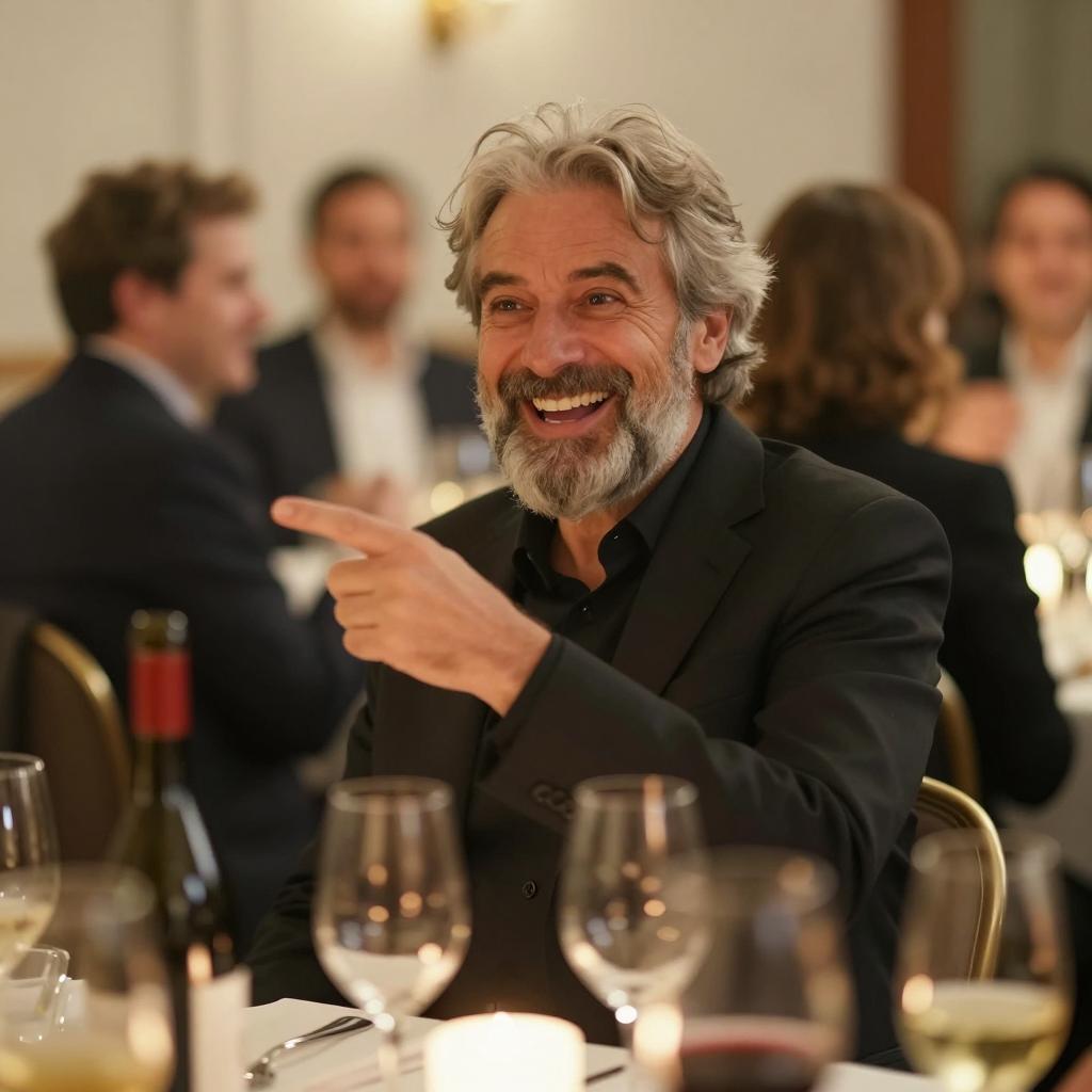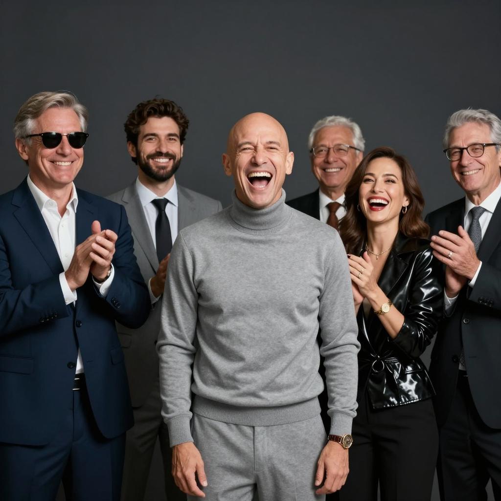 Group of six people standing, laughing and clapping. Central bald man in gray turtleneck and pants, intense open-mouth laugh. Left man in blue suit, sunglasses, right hand raised. Second man in gray suit, smiling. Woman in black glossy jacket, laughing. Two older men in suits, smiling. Dark background. Realistic photograph.