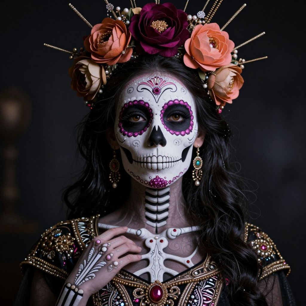 A hauntingly beautiful sugar skull woman adorned with a floral crown and ornate attire, her skeletal visage alive with intricate patterns and ethereal grace, defying the boundaries between life and death.