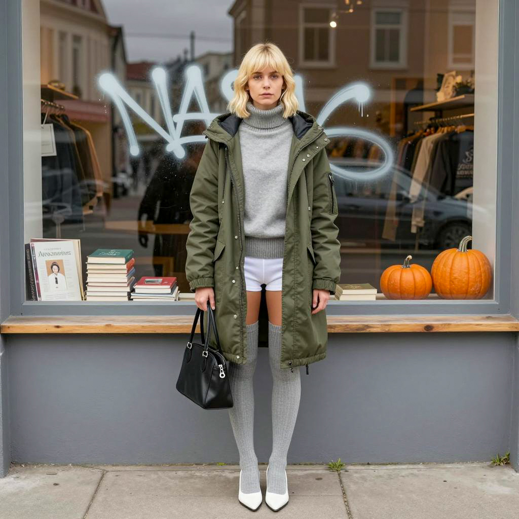 Woman standing in front of a store window. Wearing green parka, gray turtleneck sweater, white underwear, gray knee-high socks, white pointed shoes, black handbag in right hand. Short blonde hair with bangs, neutral expression. Background includes store window with white graffiti-style , books, and pumpkins. Overcast street scene reflected in window. She is centered, facing forward. Gray wall and window counter below. Urban setting.