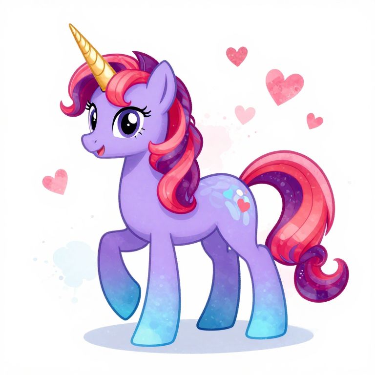 A vibrant digital illustration of a magical unicorn with a gradient body transitioning from purple to blue, featuring a golden horn and flowing red mane, set against a white background with subtle watercolor splash textures and floating hearts, evoking a whimsical and enchanting atmosphere.