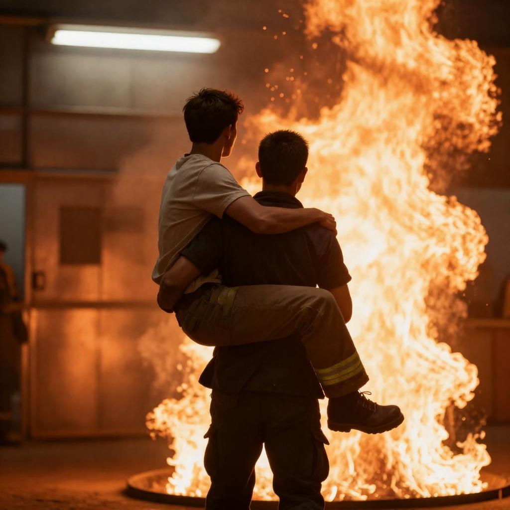 Photograph of a black male firefighter with short hair, wearing a white shirt with a colorful patch on the sleeve, crouching over a black woman with braided hair, dressed in a red shirt, on a smoky, fire-lit ground. The firefighter's intense expression focuses on the woman, who lies on the ground, partially obscured by shadows and smoke.