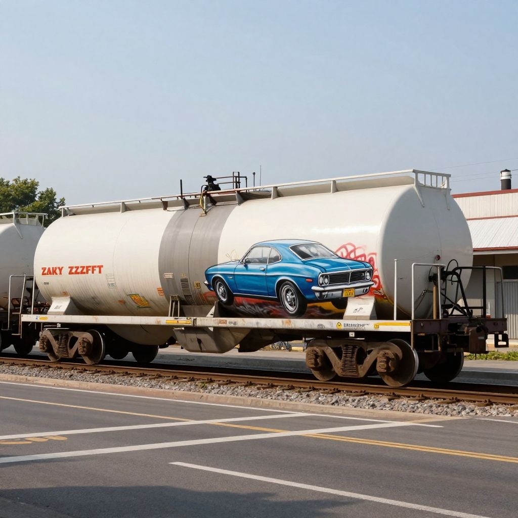 Realistic, photorealistic, HD, 4K, photorealism, photo of a petroleum transport train car, on a moving train on urban train tracks across street intersection, with a graffiti mural of a classic muscle car painted on the side, zavy-fzzgrfft