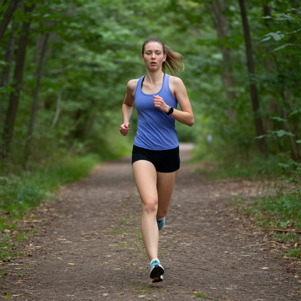 Woman running healthy on a wooded path.