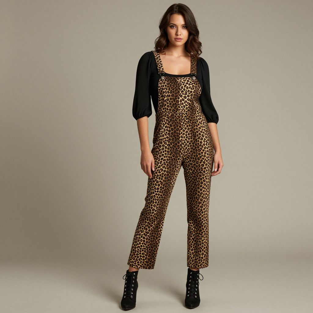 "Woman, eclectic urban, leopard print overalls, relaxed fit, straight leg, black puffed sleeve blouse underneath, scoop neckline, black lace-up ankle boots with metallic eyelets, neutral studio background.. Sexy. Pretty face and beаutiful eyes. Big breasts."