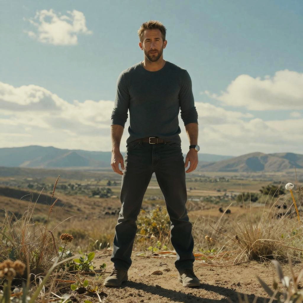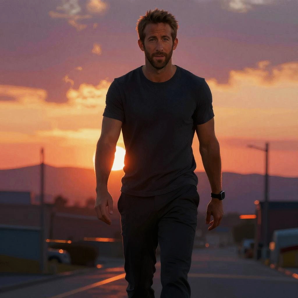 Ryan Reynolds nude silhouette at sunset, abstract expressionism, vibrant colors and dramatic shadows