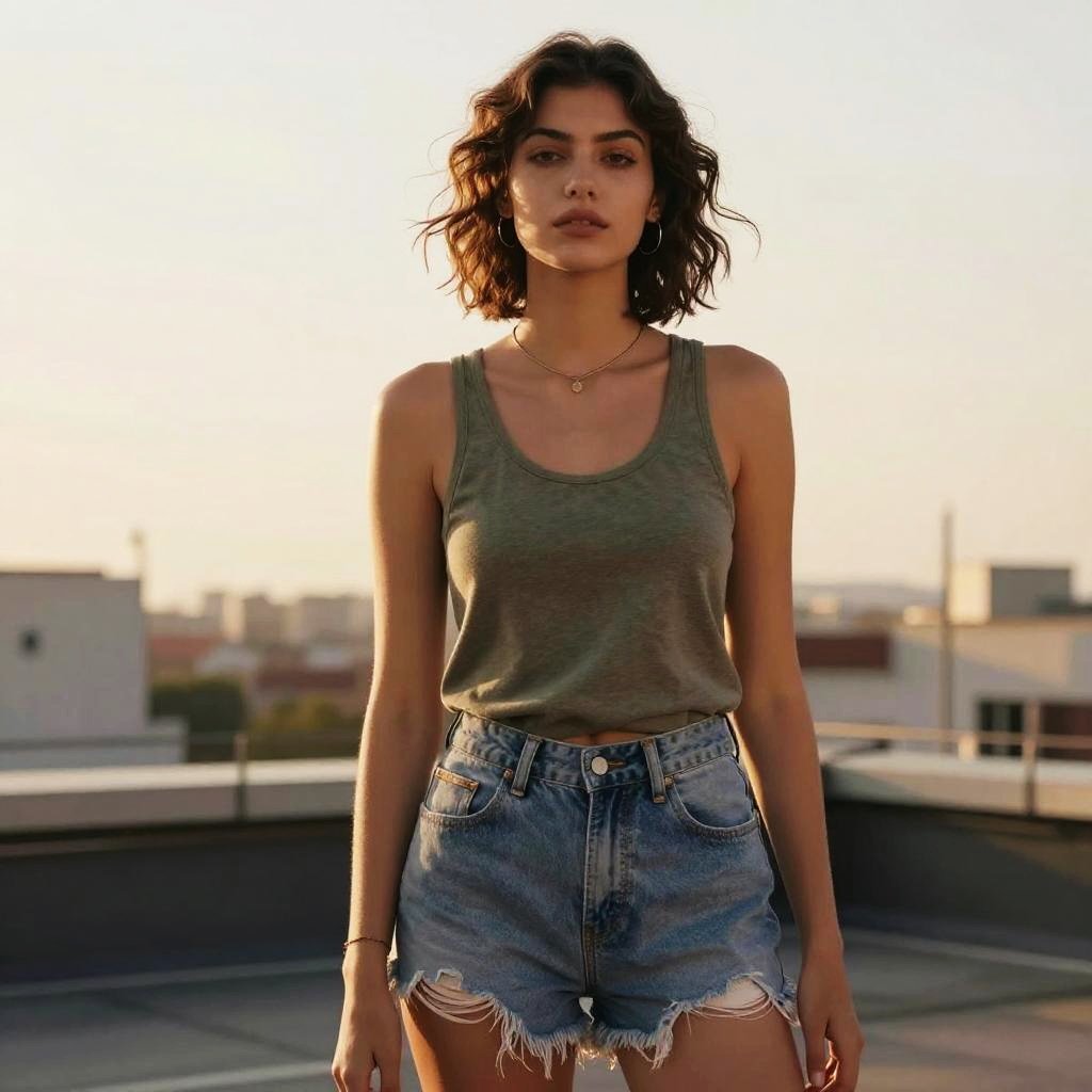 A high-fashion editorial portrait of serene young woman, wearing silk cherry-red camisole with spaghetti straps and cream-colored leather-look tapered trousers, set against neon-lit rooftop at twilight, with thin layered gold necklaces shimmering, shallow depth of field and vibrant textures for a cinematic vibe.
