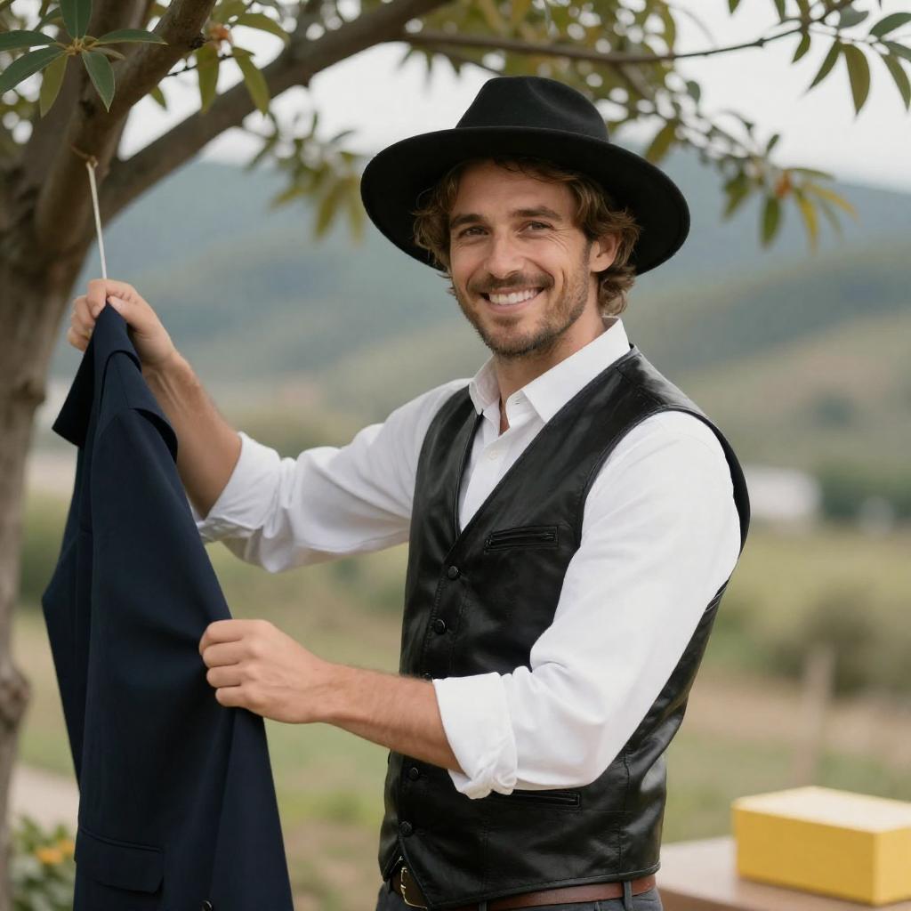 Photograph of a smiling man with light brown hair, wearing a black hat, white shirt, and black leather vest, holding a piece of clothing. He stands in front of a tree with green leaves and hills in the background. Another piece of clothing hangs from the tree. Yellow rectangular box in the bottom right corner.
