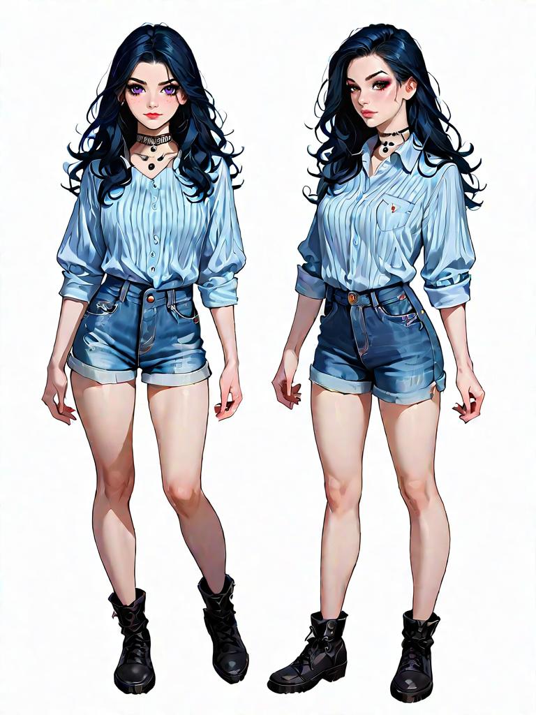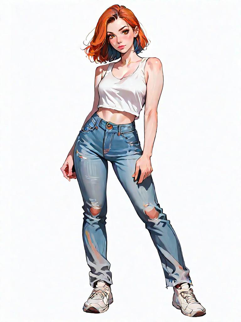1girl, source_comics, realistic face, full body shot, Woman, casual contemporary, striped overalls in beige and white, cropped length, buttoned straps, square neckline, front pocket, layered over gray crewneck sweatshirt, long sleeves, neon green socks, white low-top sneakers, minimal makeup, simple ponytail, posed on white block, plain white background