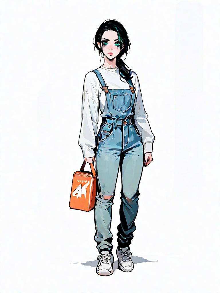 Illustration of a young woman standing against a plain white background, wearing light blue denim overalls with buttoned straps and a front pocket, layered over a white long-sleeve sweatshirt. She has dark hair tied in a loose ponytail and is wearing white sneakers. The woman is holding an orange rectangular handbag in her left hand and has a serious expression on her face.