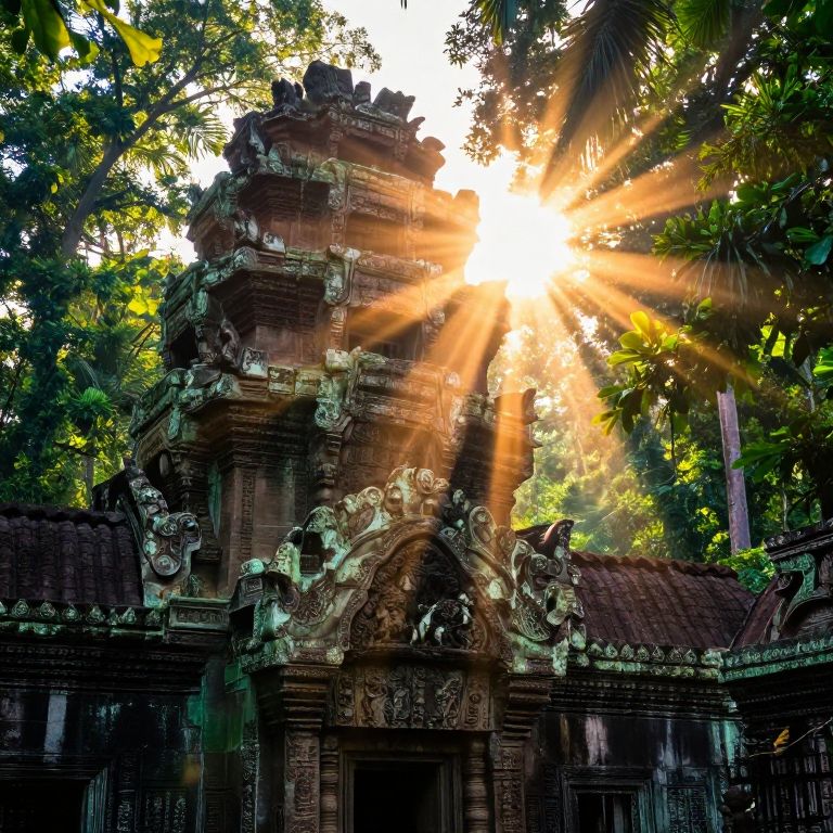 Photograph of an ancient, moss-covered Hindu temple with intricate carvings, sun rays bursting through dense forest canopy, creating a radiant, ethereal